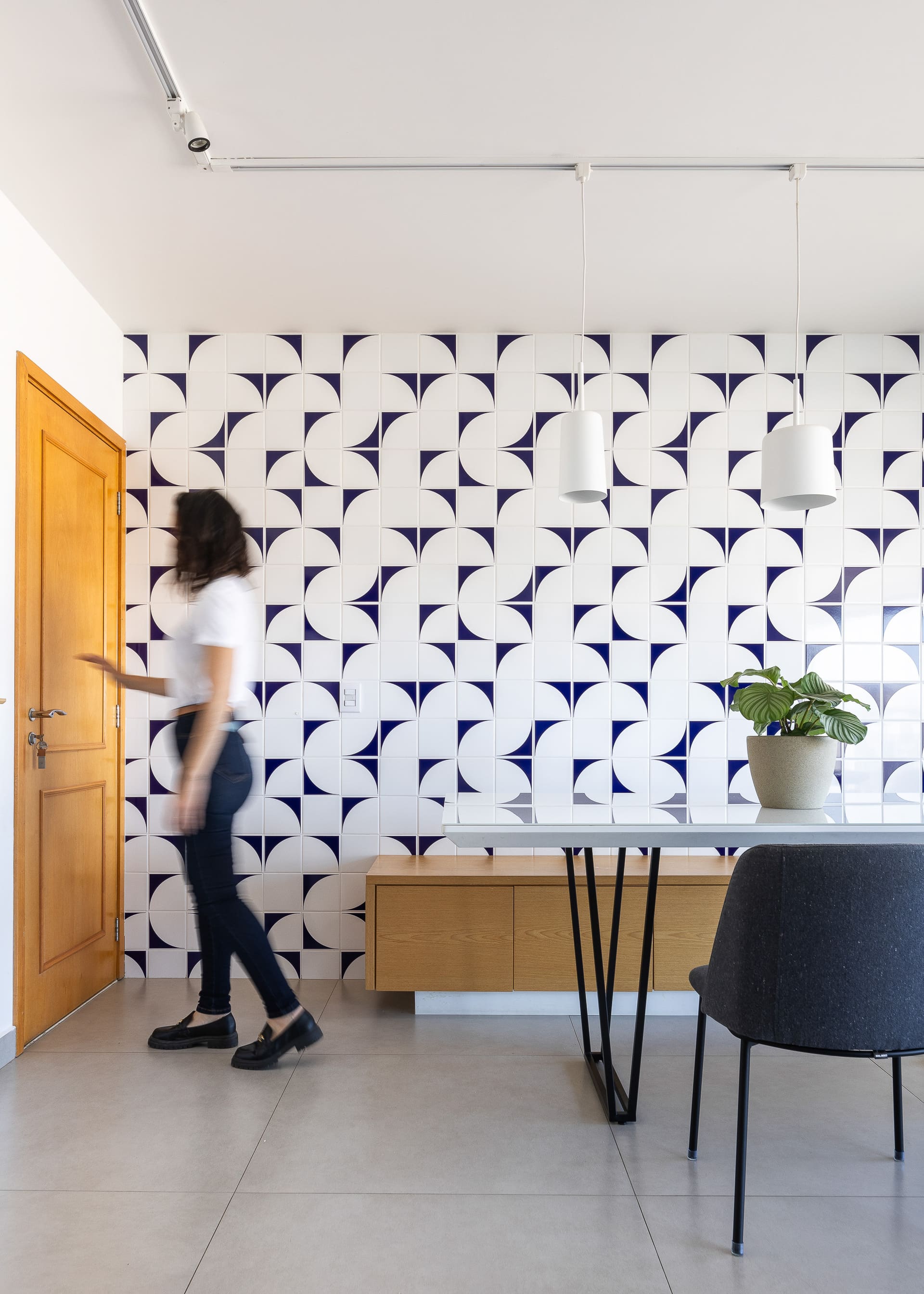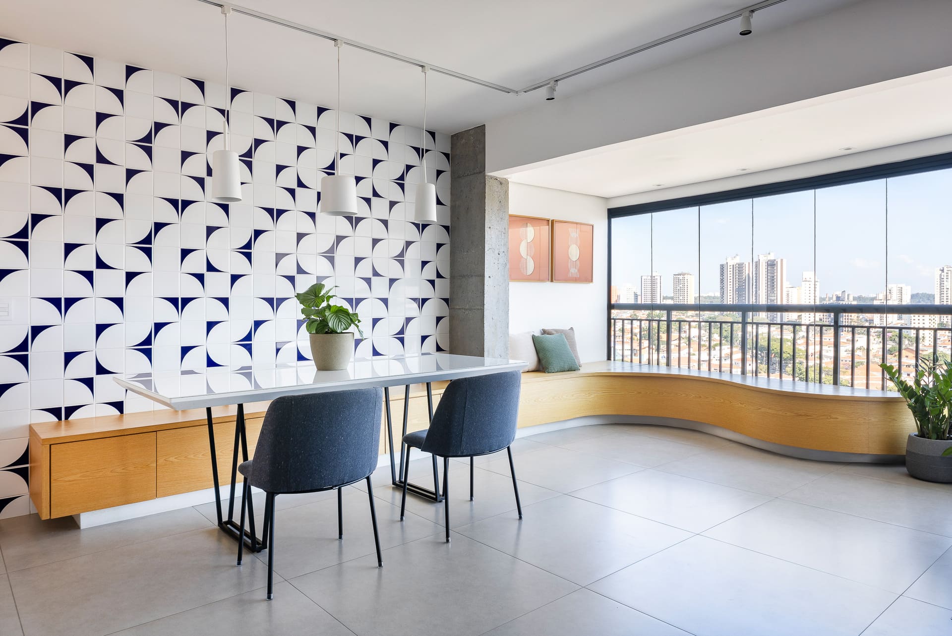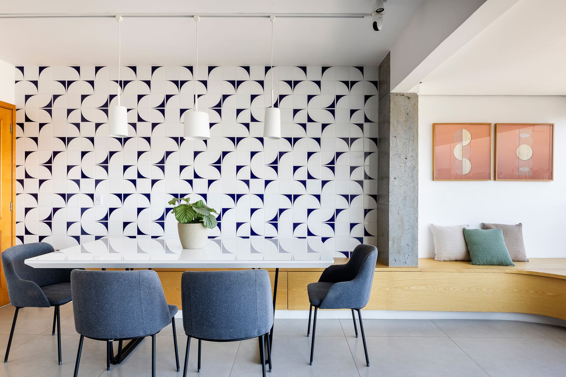 O painel de azulejos azuis completa a composição — além de proteger a parede contra marcas de uso, ele cria um pano de fundo vibrante, na medida certa, que valoriza o banco e dá personalidade ao espaço.