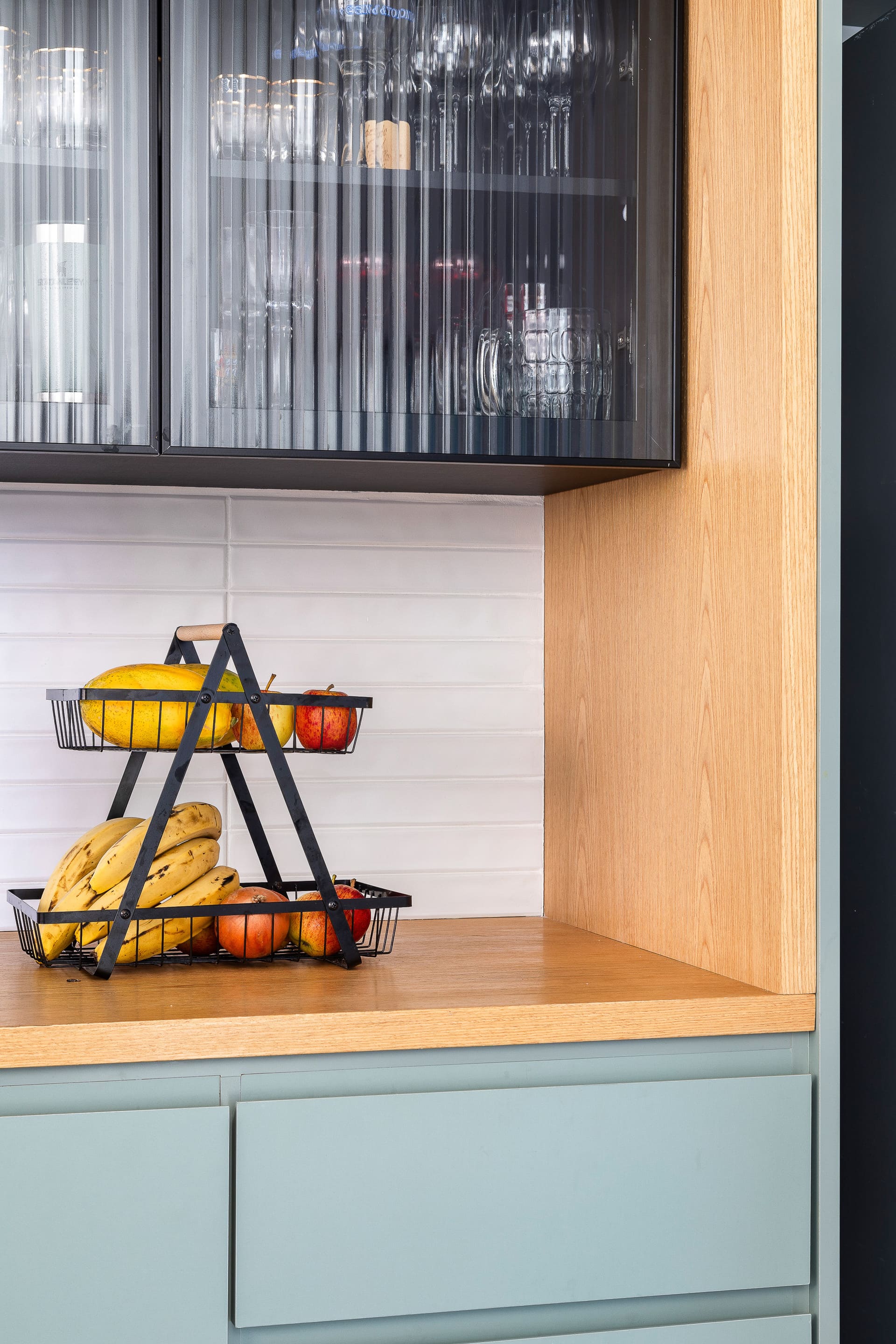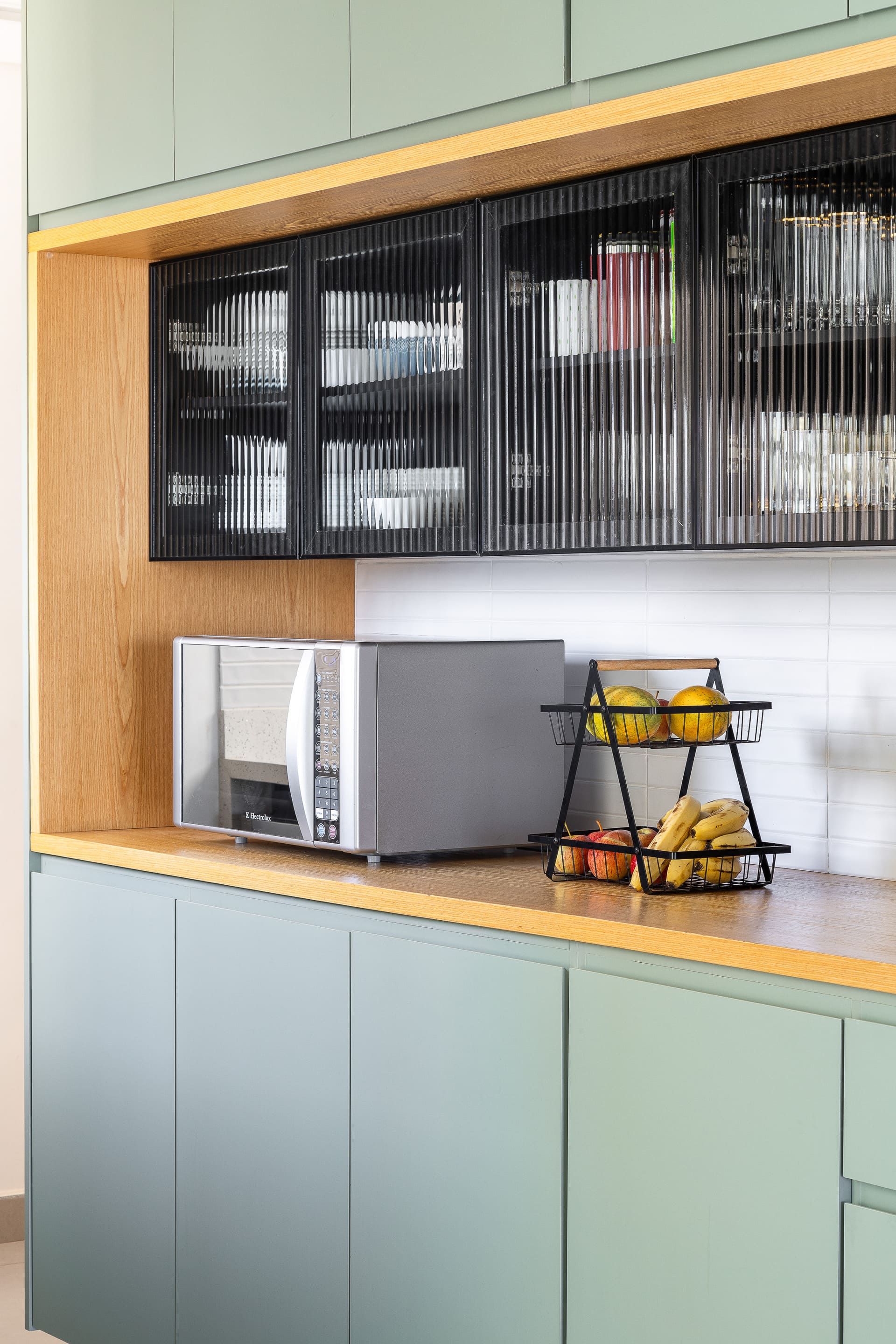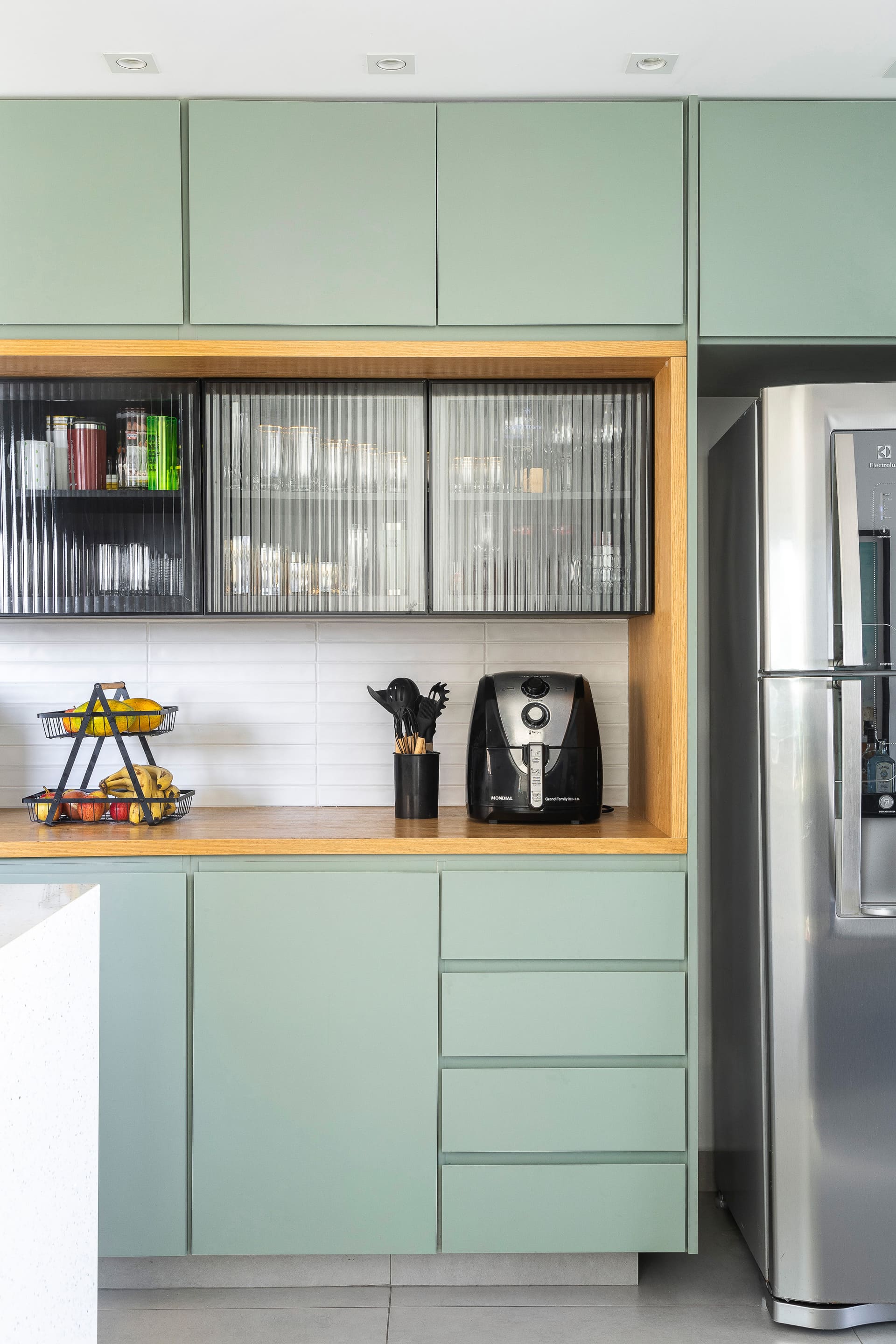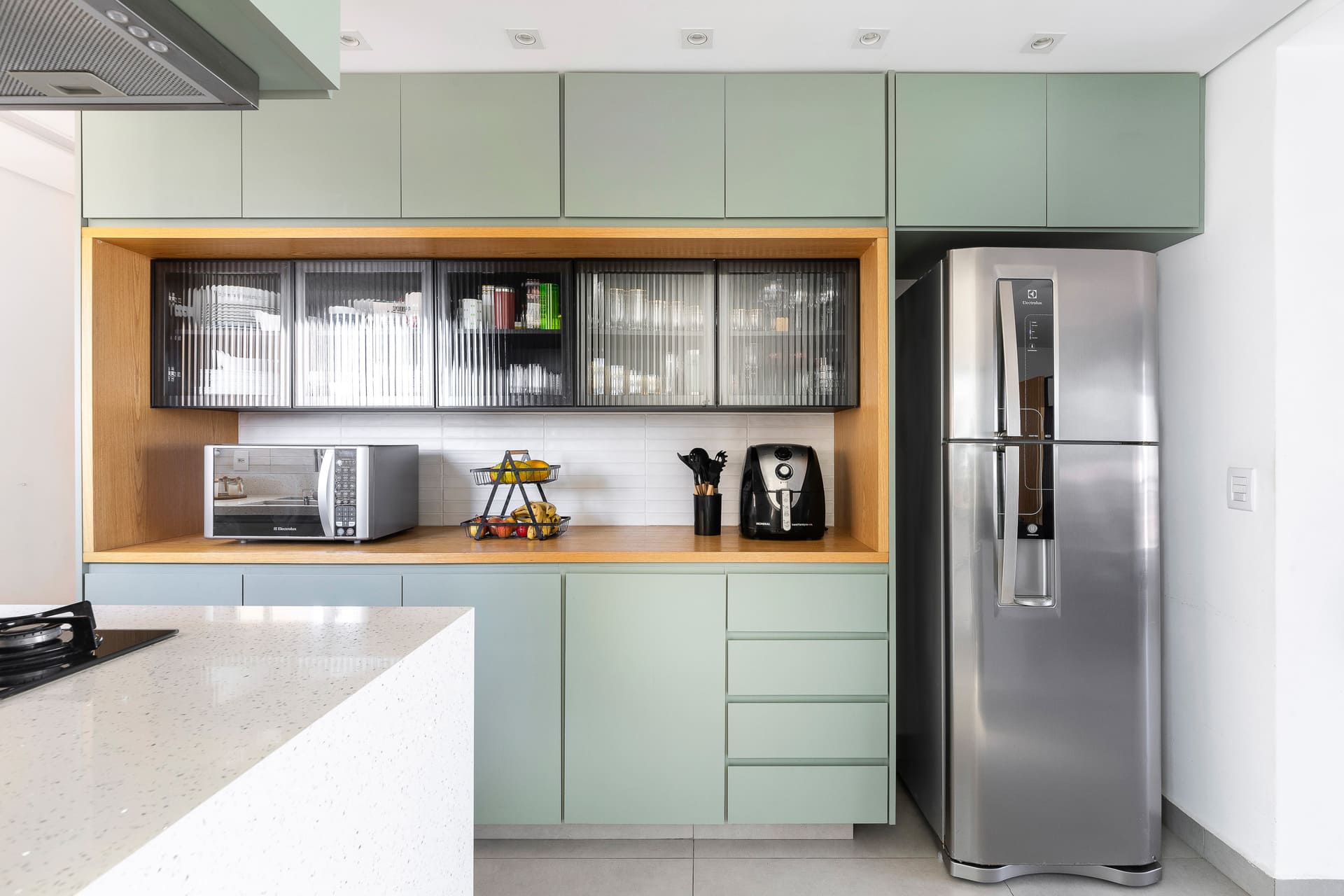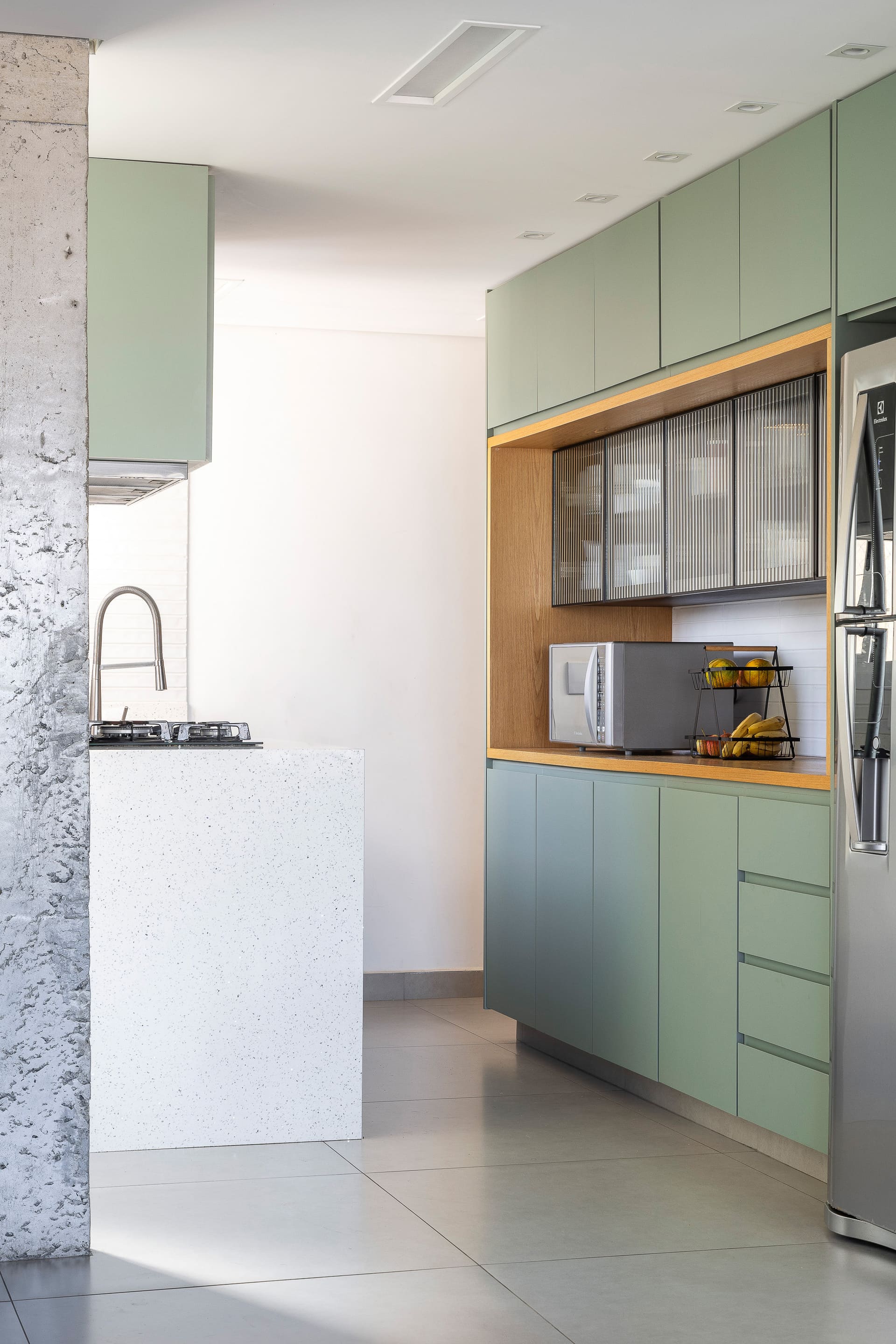 Na cozinha, a sensação é de calma e leveza. A marcenaria sob medida foi pensada para oferecer o máximo de funcionalidade, com amplos espaços de armazenagem e apoio para eletrodomésticos, sem abrir mão da delicadeza visual. As cores claras e o uso do vidro canelado reforçam essa atmosfera serena.