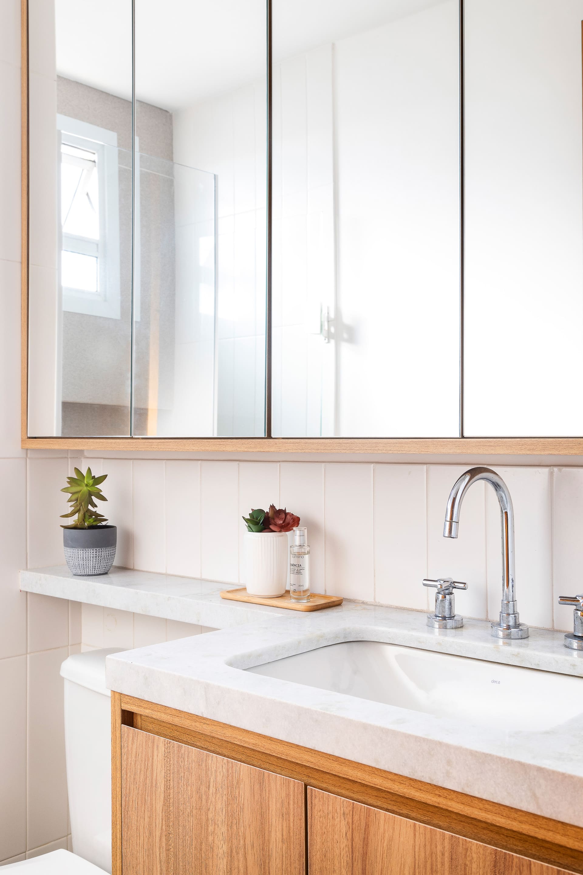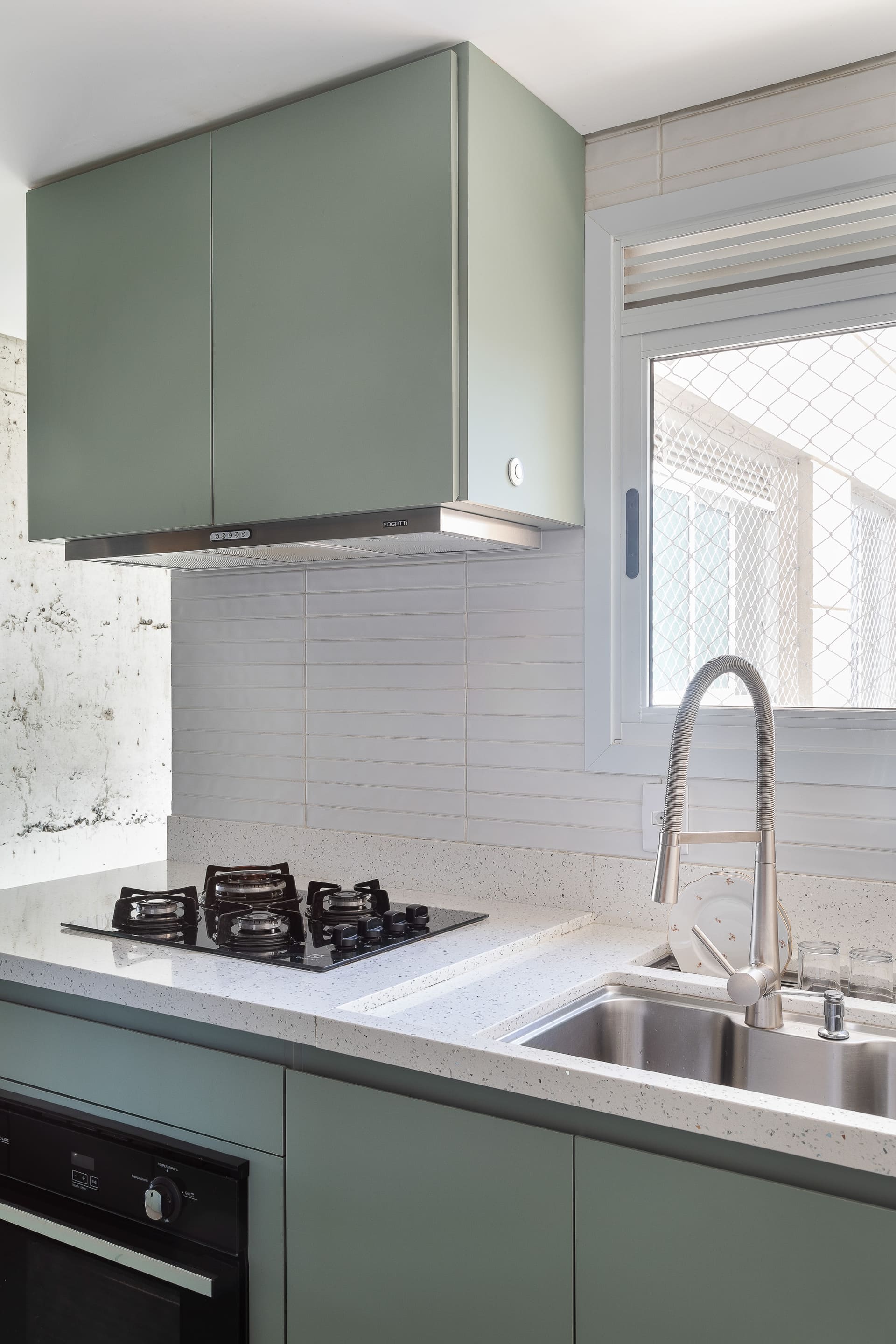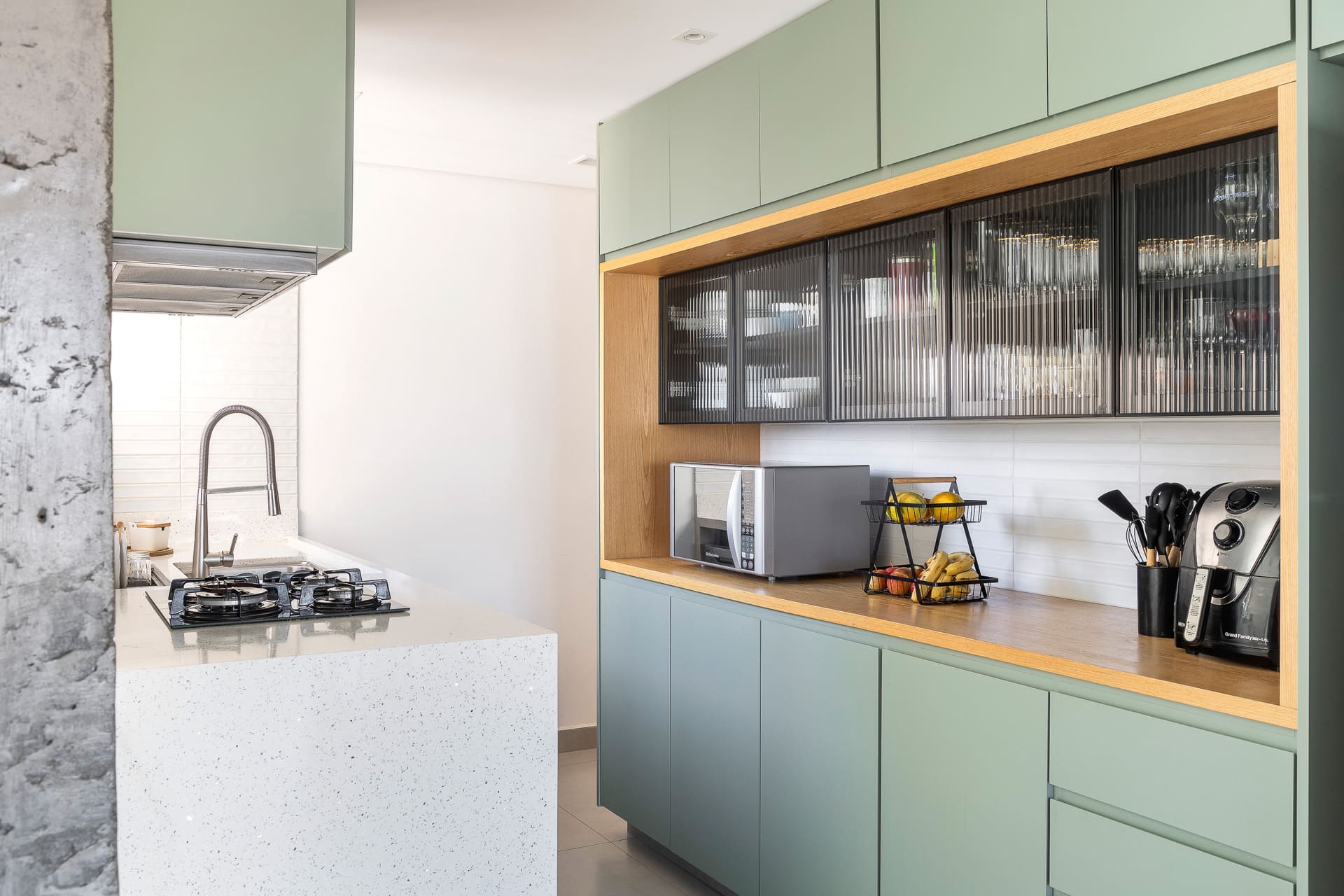 Embora a transformação da cozinha tenha sido completa, o projeto preservou todos os pontos originais de hidráulica — pia, filtro e máquina de lavar louça mantiveram-se em seus lugares. Essa decisão, além de otimizar o custo e o prazo da obra, demonstrou que é possível renovar inteiramente um ambiente sem grandes demolições ou deslocamentos de infraestrutura.