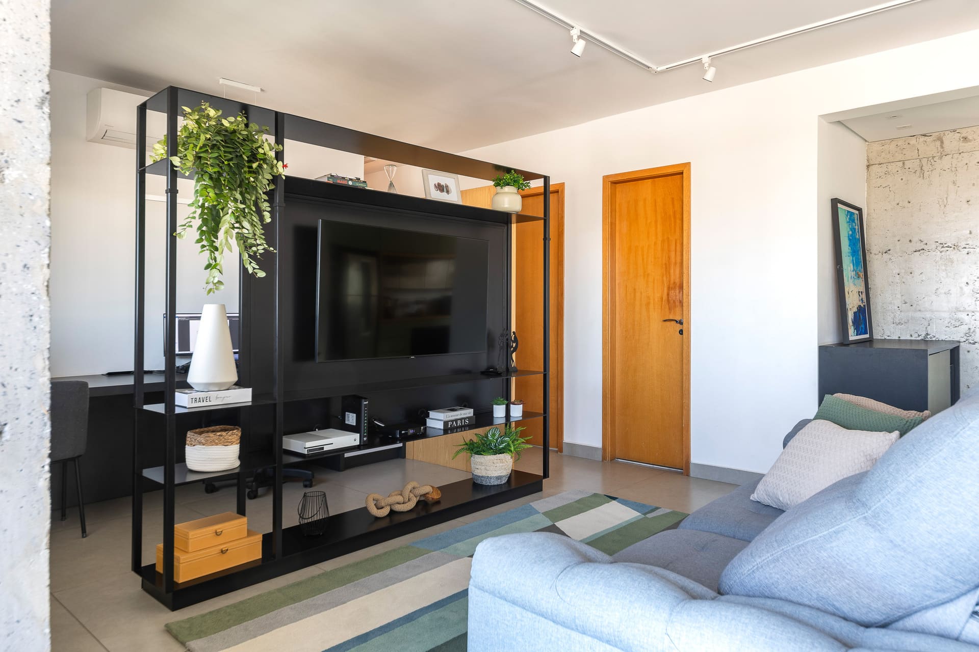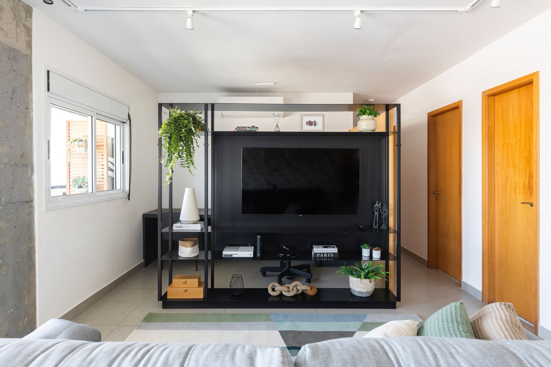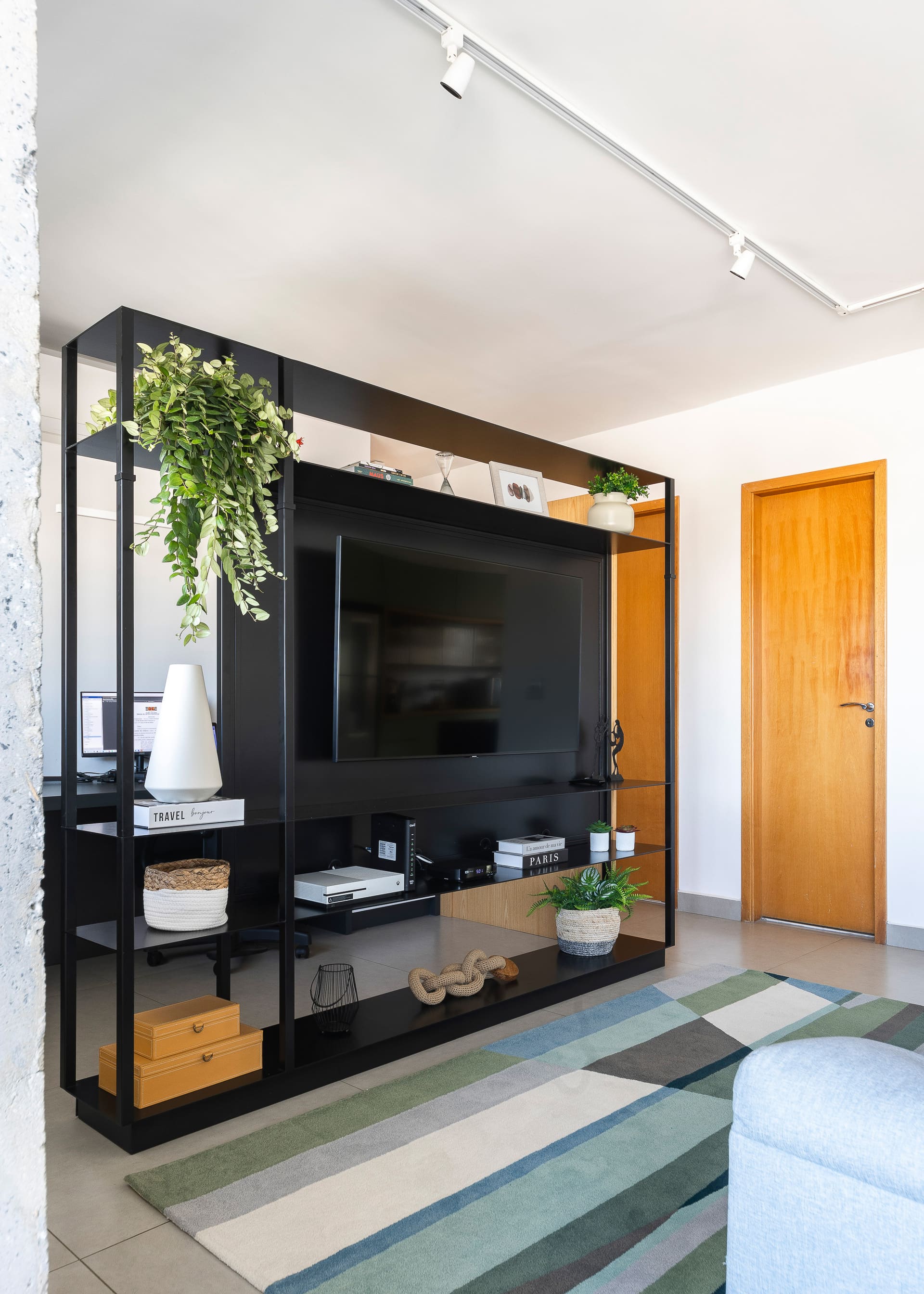 Na sala, a estante metálica desenhada sob medida pelo nosso estúdio cumpre papel essencial: separar a área de televisão do espaço de home office. Após a pandemia, o trabalho remoto ganhou protagonismo, e ter um ambiente dedicado a isso dentro de casa se tornou indispensável. A estante, vazada na parte superior e inferior, garante a integração visual entre os ambientes, enquanto uma chapa lisa na área da TV oferece privacidade e acolhimento. Toda a fiação elétrica foi cuidadosamente embutida na estrutura metálica, assegurando um resultado limpo e elegante.