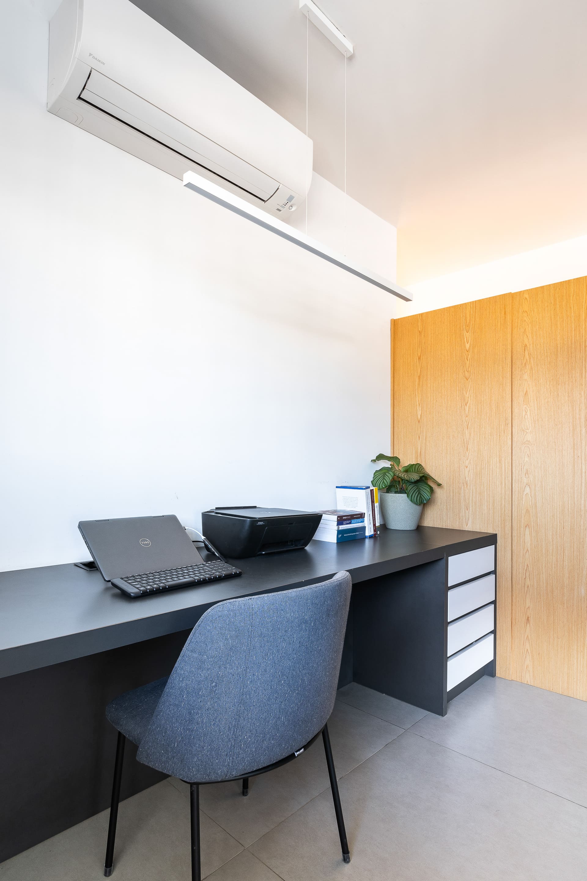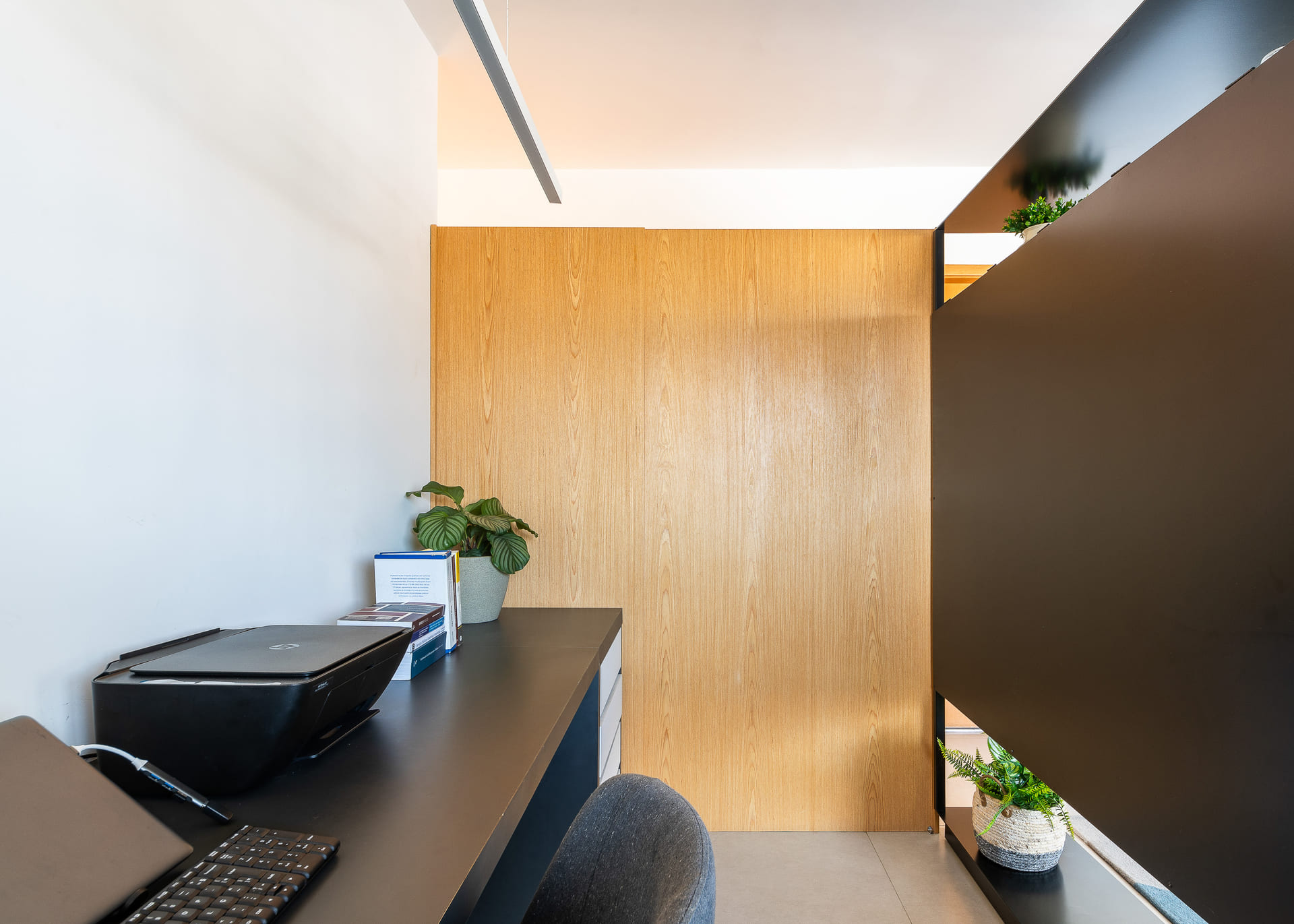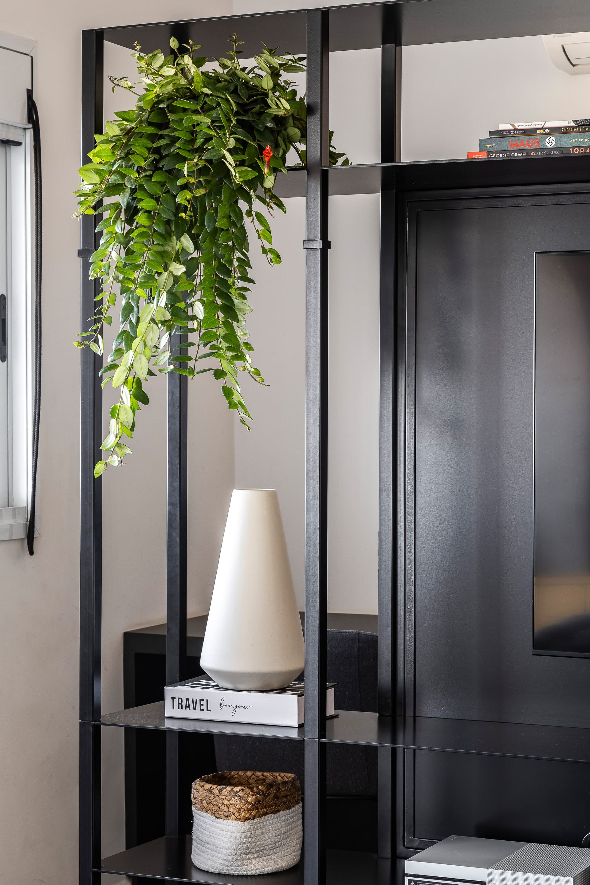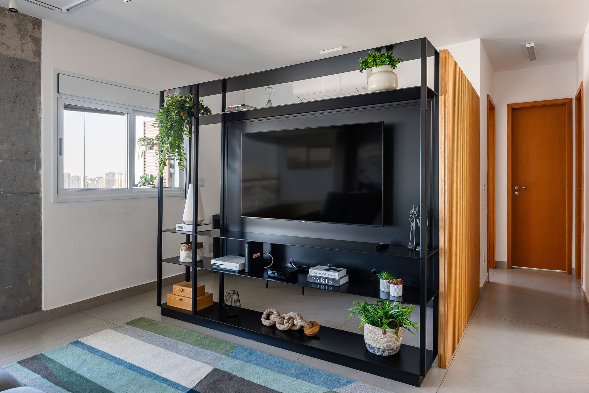 Na sala, a estante metálica desenhada sob medida pelo nosso estúdio cumpre papel essencial: separar a área de televisão do espaço de home office. Após a pandemia, o trabalho remoto ganhou protagonismo, e ter um ambiente dedicado a isso dentro de casa se tornou indispensável. A estante, vazada na parte superior e inferior, garante a integração visual entre os ambientes, enquanto uma chapa lisa na área da TV oferece privacidade e acolhimento. Toda a fiação elétrica foi cuidadosamente embutida na estrutura metálica, assegurando um resultado limpo e elegante.