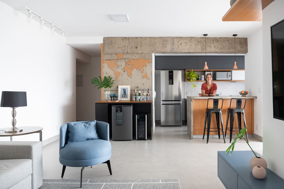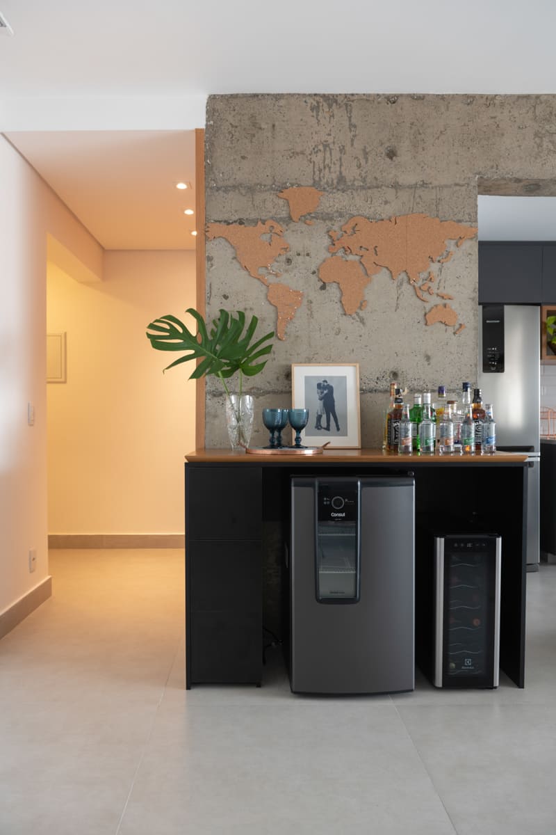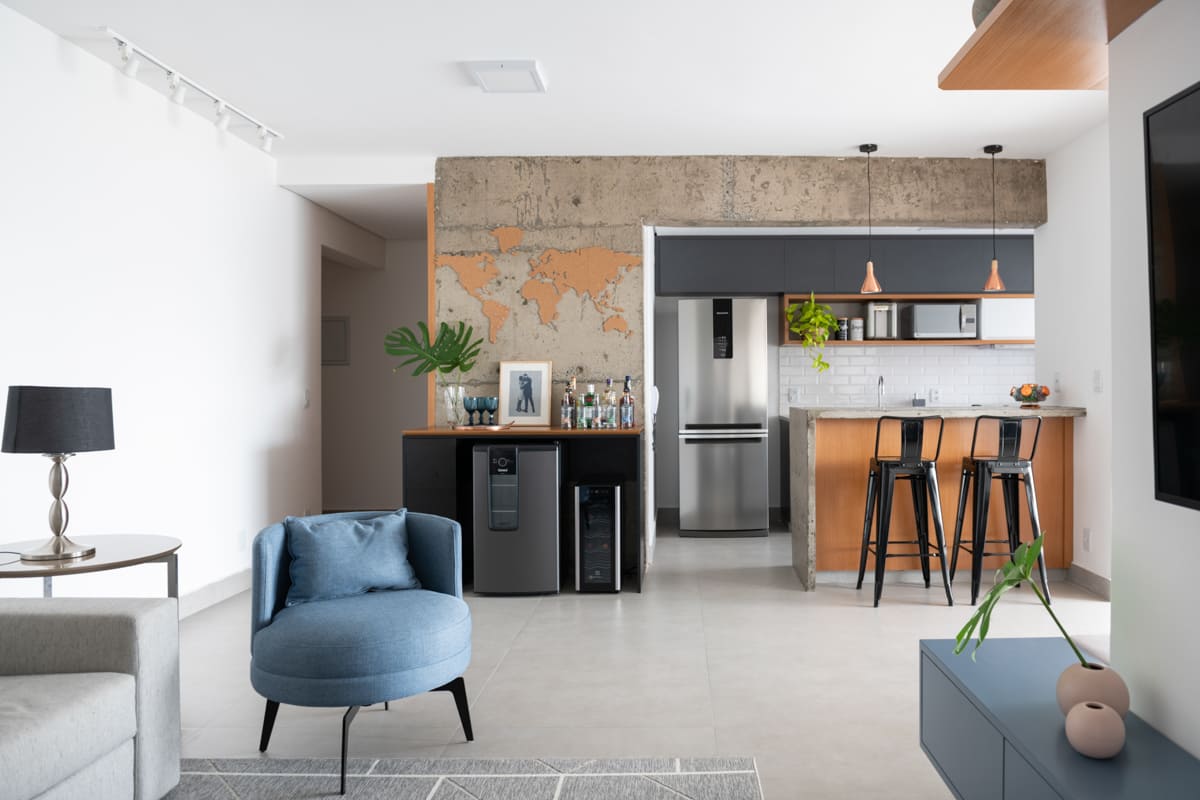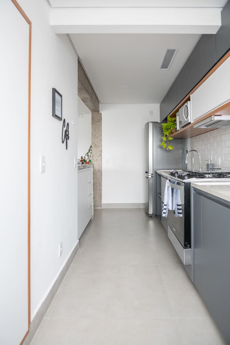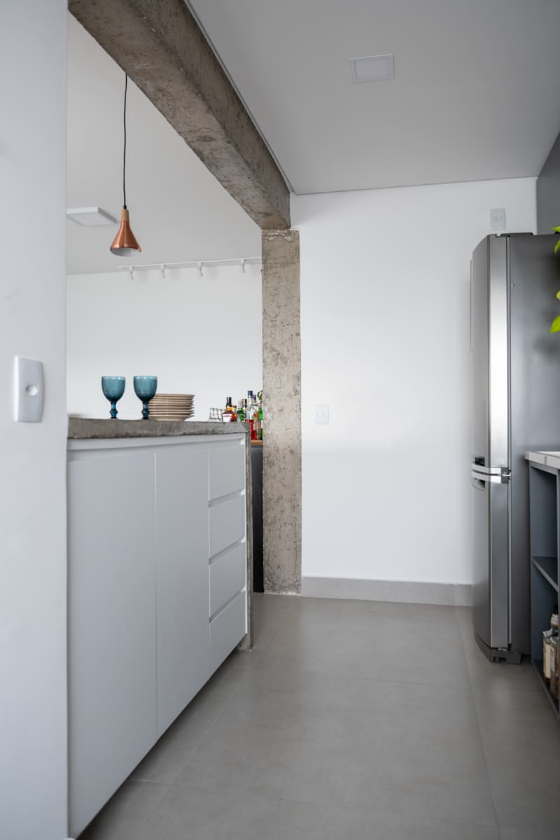 Durante a obra, uma das decisões mais marcantes foi deixar à mostra a viga estrutural do edifício e o pilar principal — elementos que originalmente seriam escondidos, mas que passaram a compor a estética do apartamento. Retiramos a pintura e a massa corrida, revelando o concreto aparente que emoldura a passagem para a cozinha e se tornou um ponto de destaque na composição de materiais e texturas.