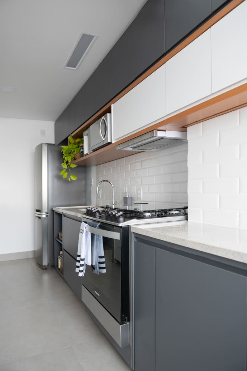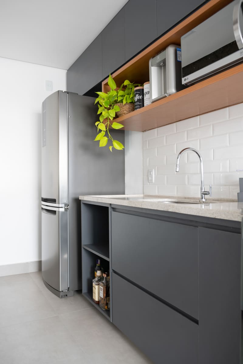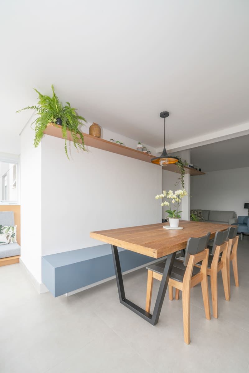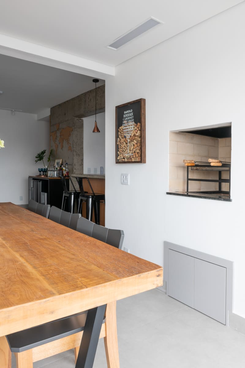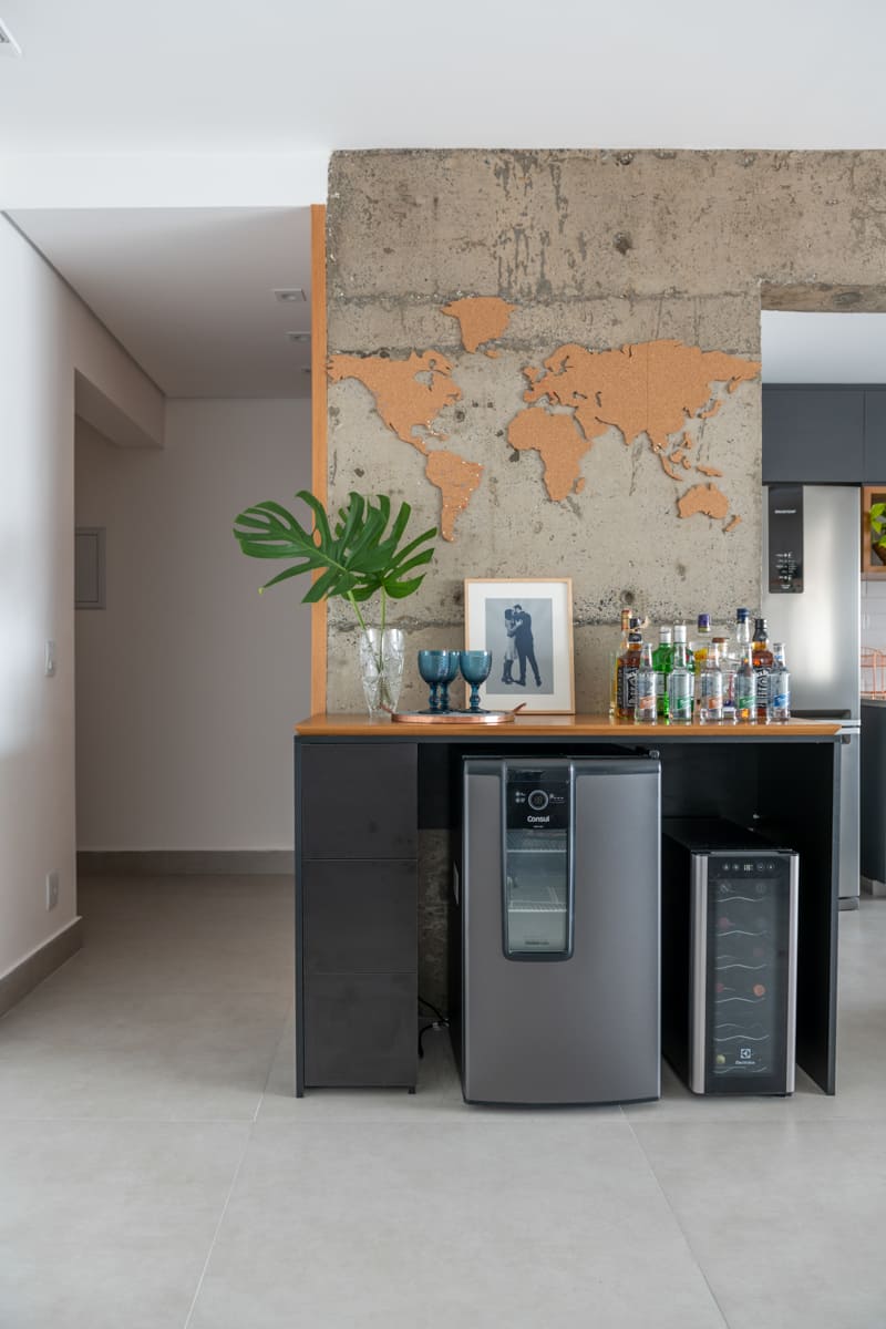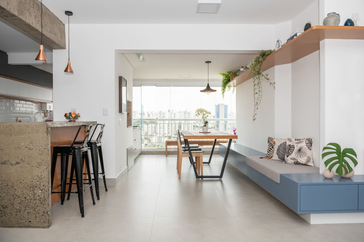 Durante a obra, uma das decisões mais marcantes foi deixar à mostra a viga estrutural do edifício e o pilar principal — elementos que originalmente seriam escondidos, mas que passaram a compor a estética do apartamento. Retiramos a pintura e a massa corrida, revelando o concreto aparente que emoldura a passagem para a cozinha e se tornou um ponto de destaque na composição de materiais e texturas.