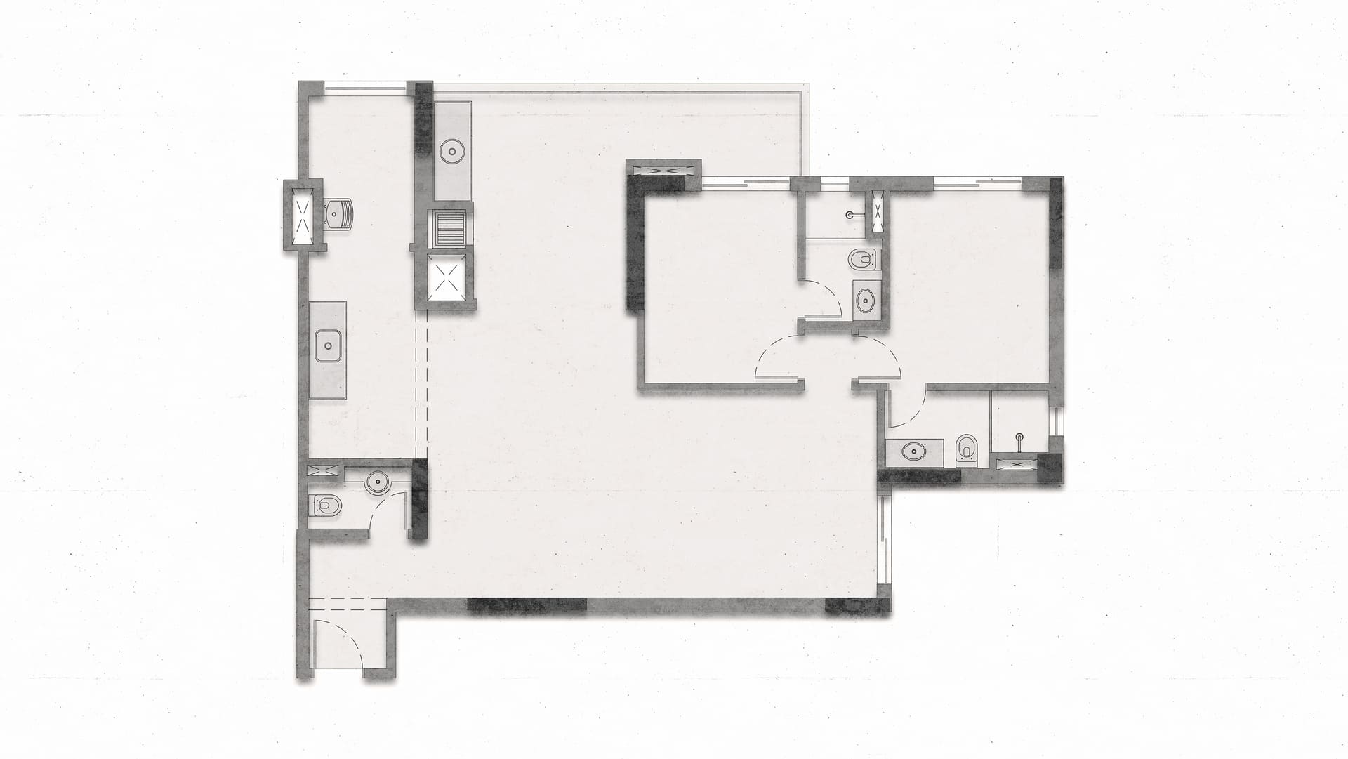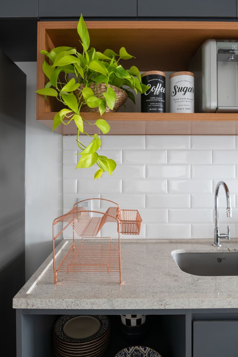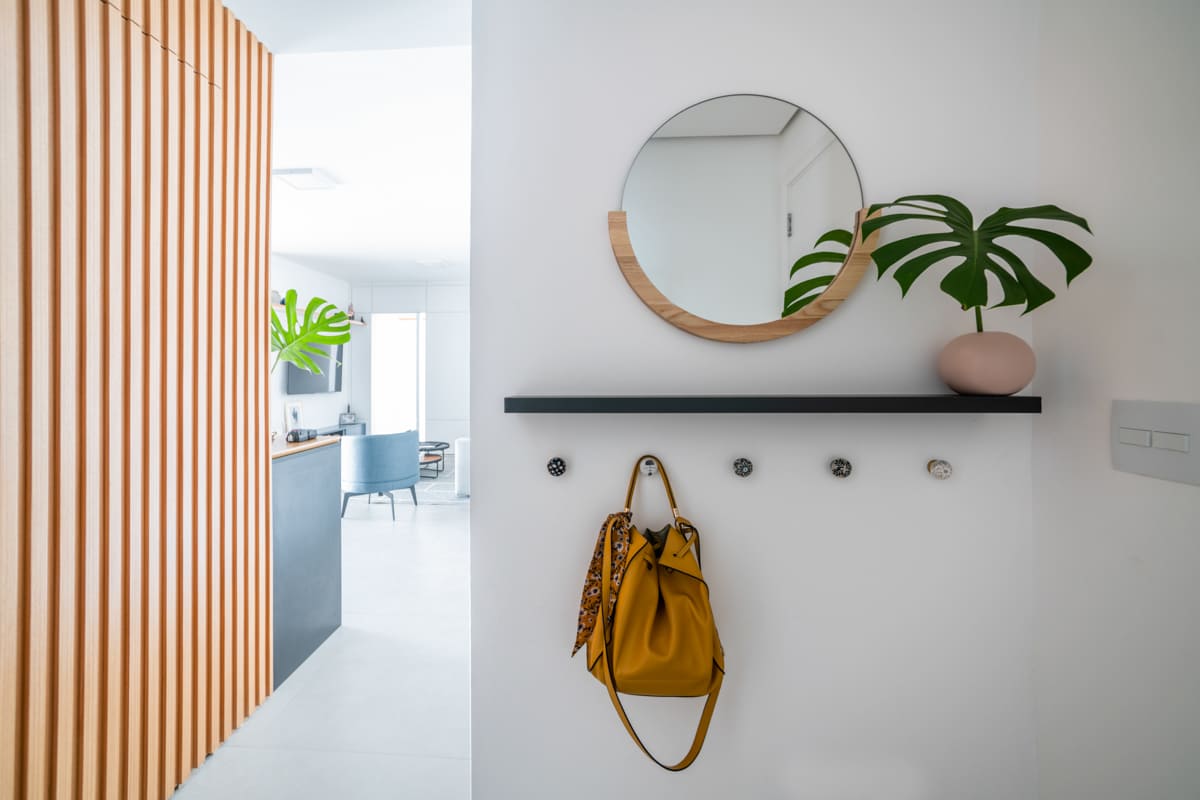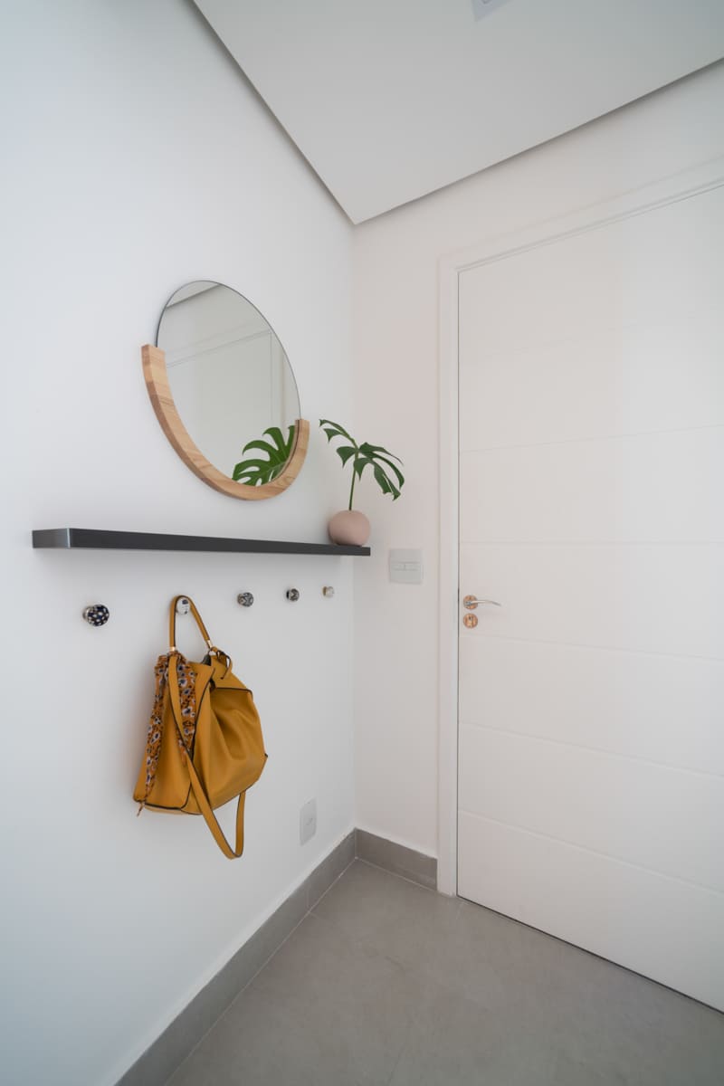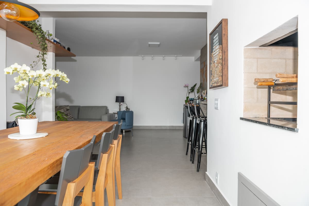 Durante a obra, uma das decisões mais marcantes foi deixar à mostra a viga estrutural do edifício e o pilar principal — elementos que originalmente seriam escondidos, mas que passaram a compor a estética do apartamento. Retiramos a pintura e a massa corrida, revelando o concreto aparente que emoldura a passagem para a cozinha e se tornou um ponto de destaque na composição de materiais e texturas.