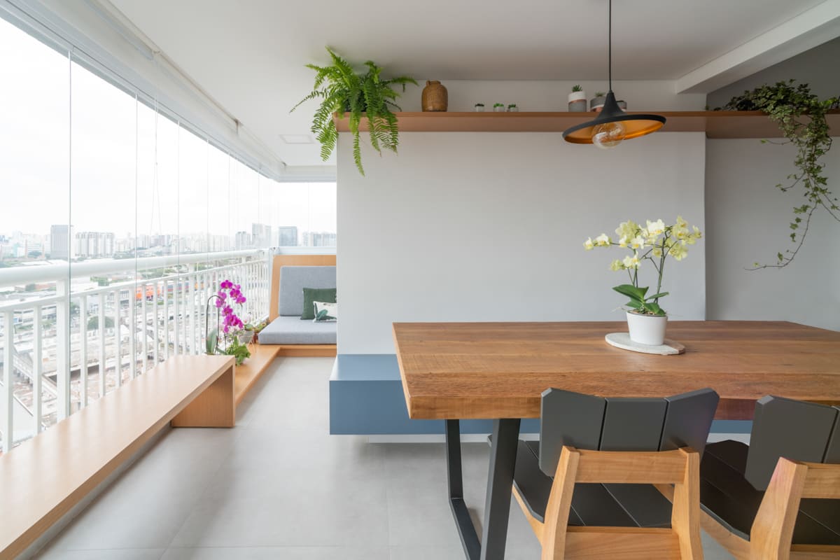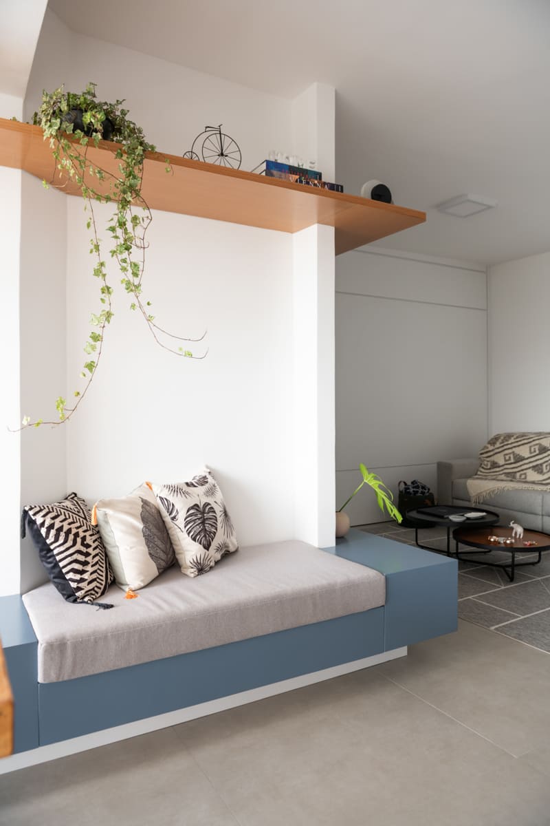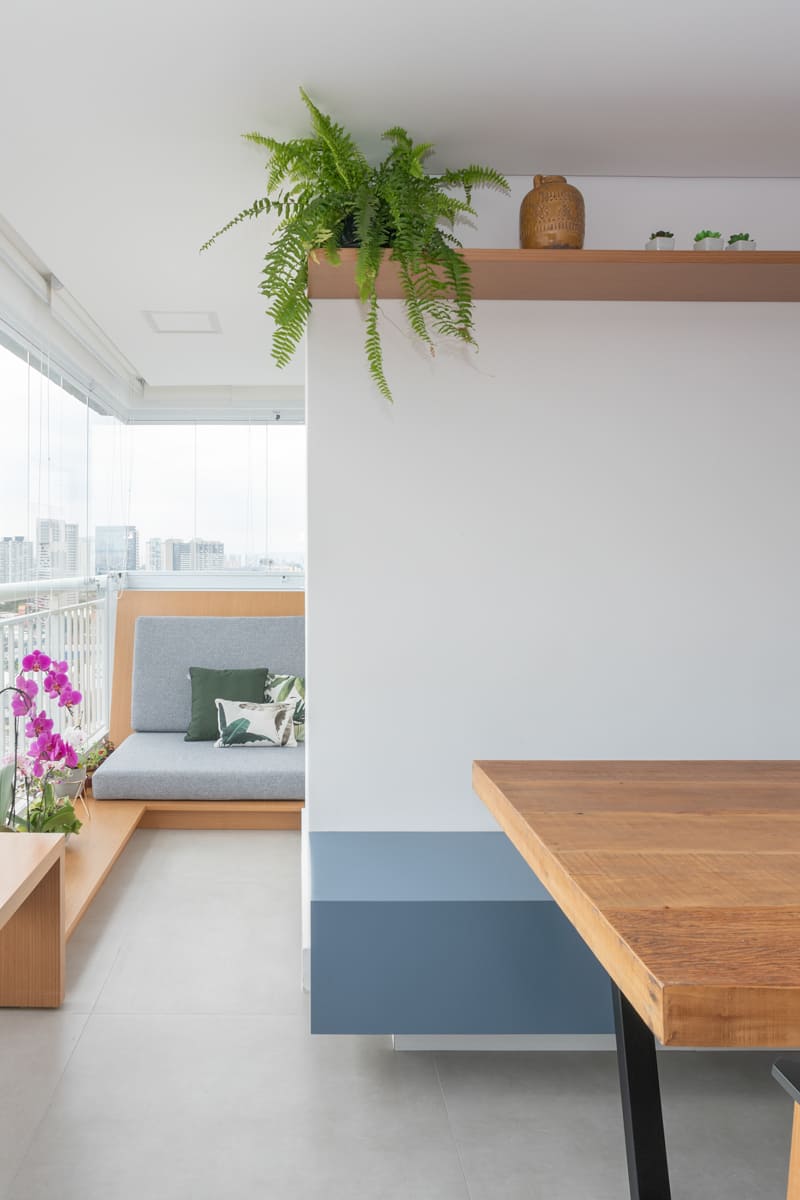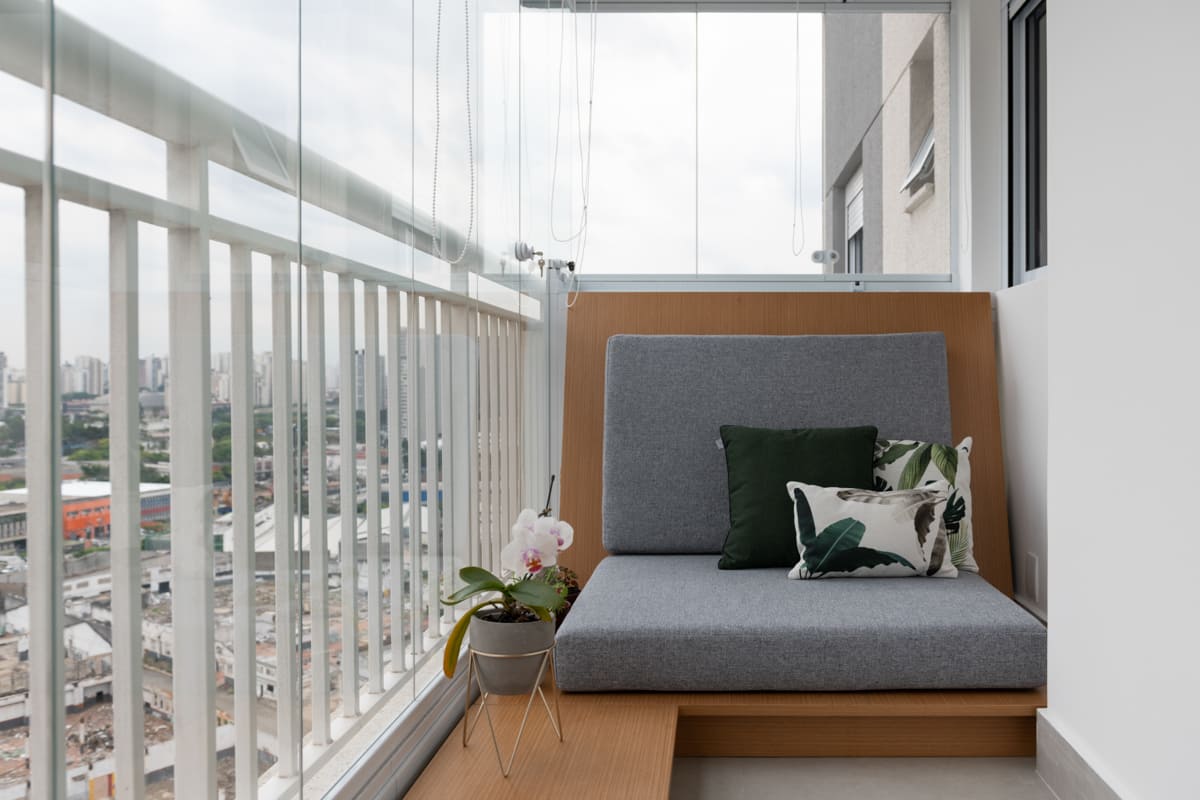 Cada detalhe foi pensado para proporcionar encontros e momentos de convivência. Entre a sala e a varanda, dois cantinhos com almofadas sob medida convidam a sentar, conversar e aproveitar a casa. O Apto MD é sobre isso: um espaço que reflete o morar contemporâneo, onde a arquitetura, a estrutura e a marcenaria se unem para acolher e aproximar.