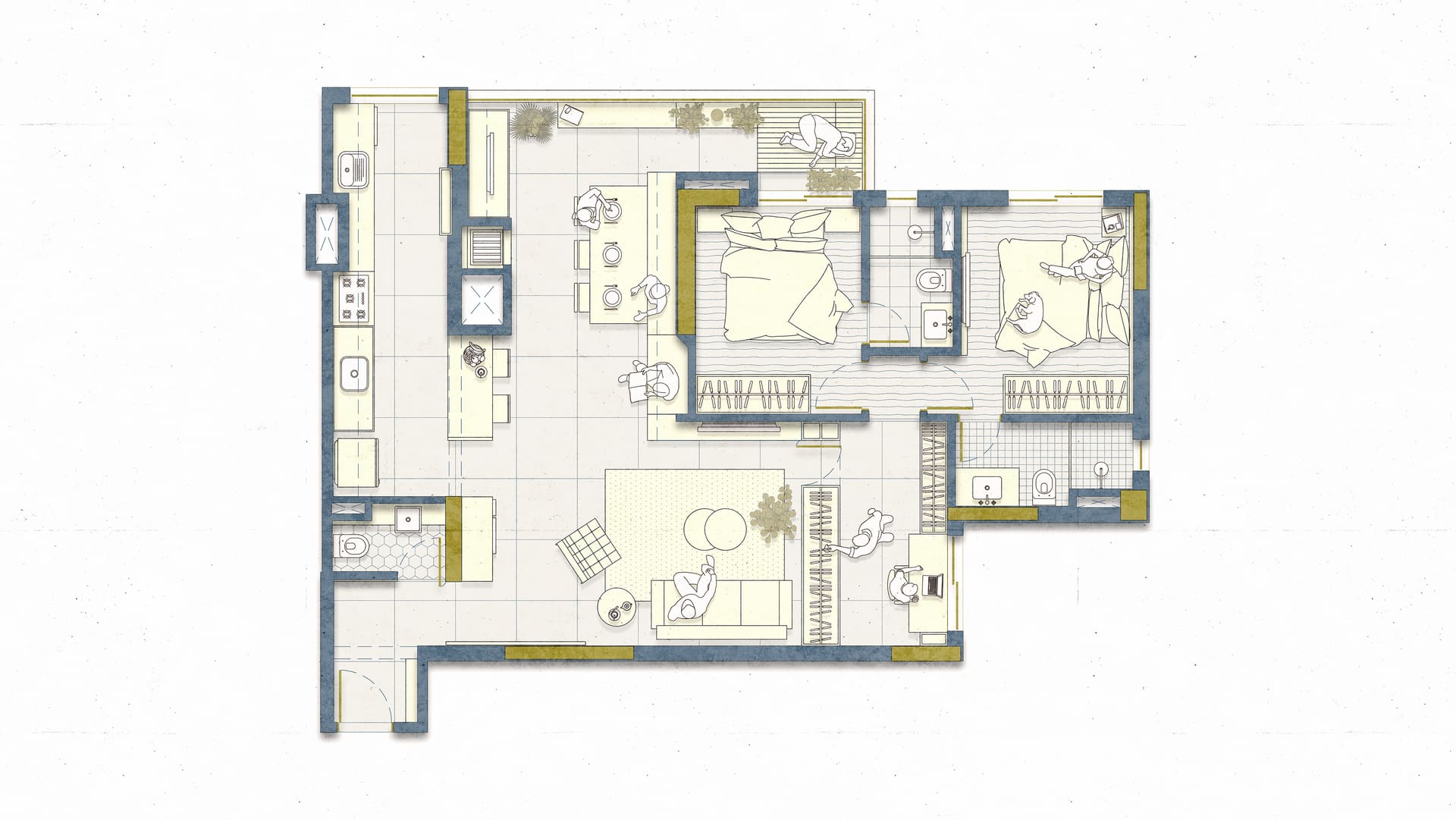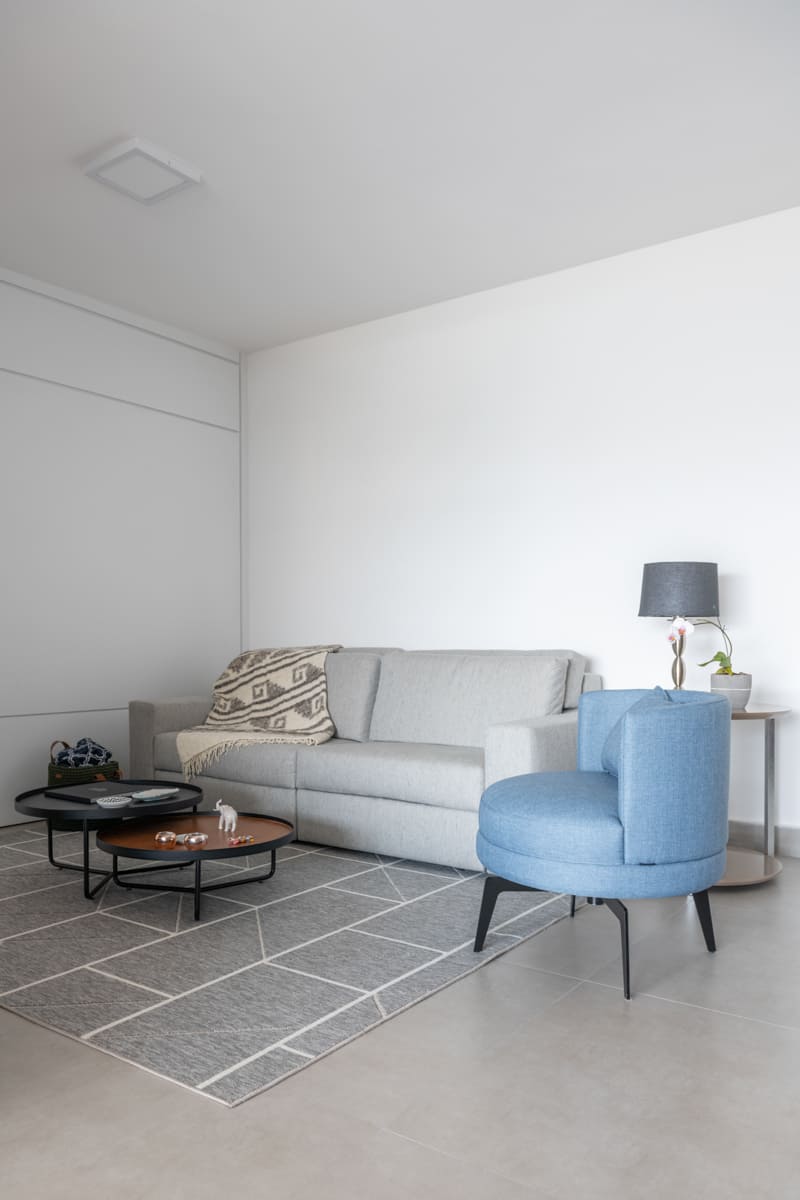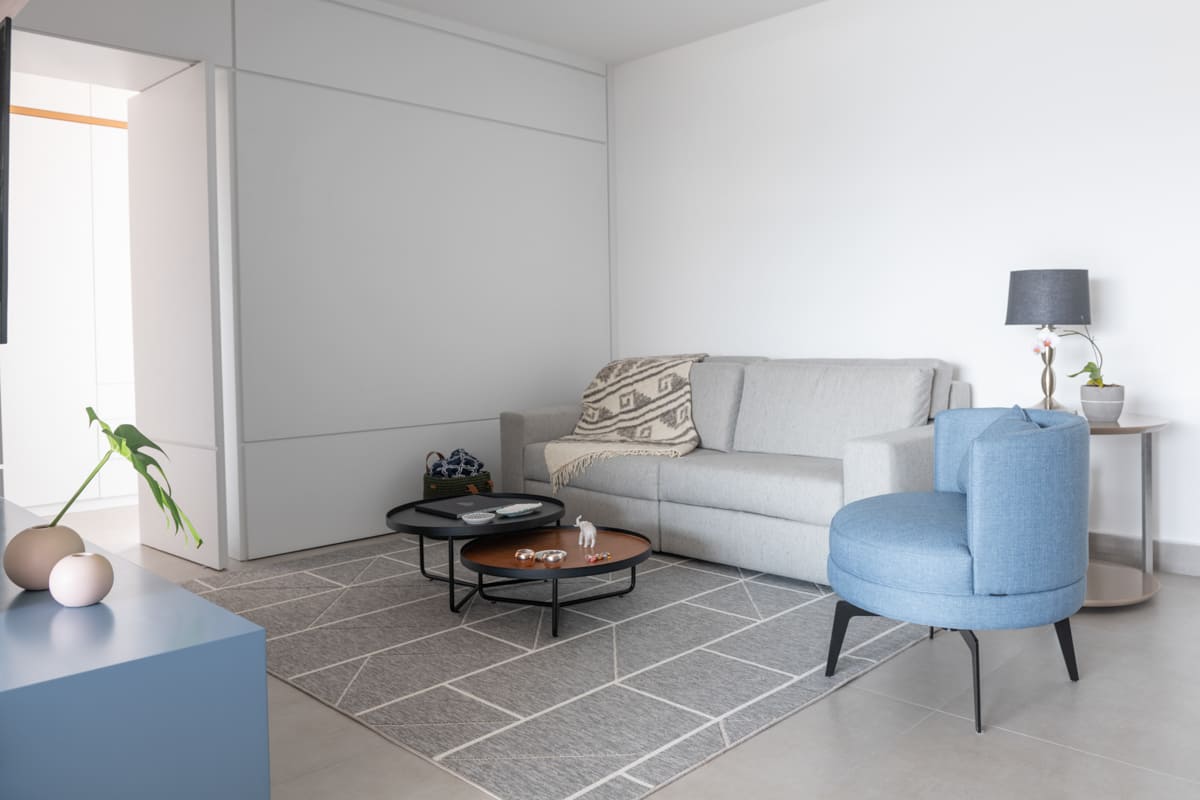 Cada detalhe foi pensado para proporcionar encontros e momentos de convivência. Entre a sala e a varanda, dois cantinhos com almofadas sob medida convidam a sentar, conversar e aproveitar a casa. O Apto MD é sobre isso: um espaço que reflete o morar contemporâneo, onde a arquitetura, a estrutura e a marcenaria se unem para acolher e aproximar.