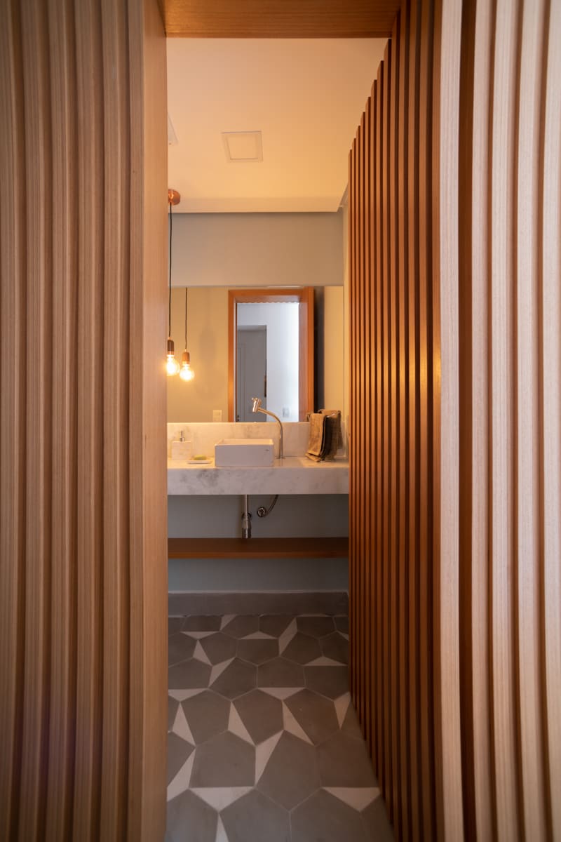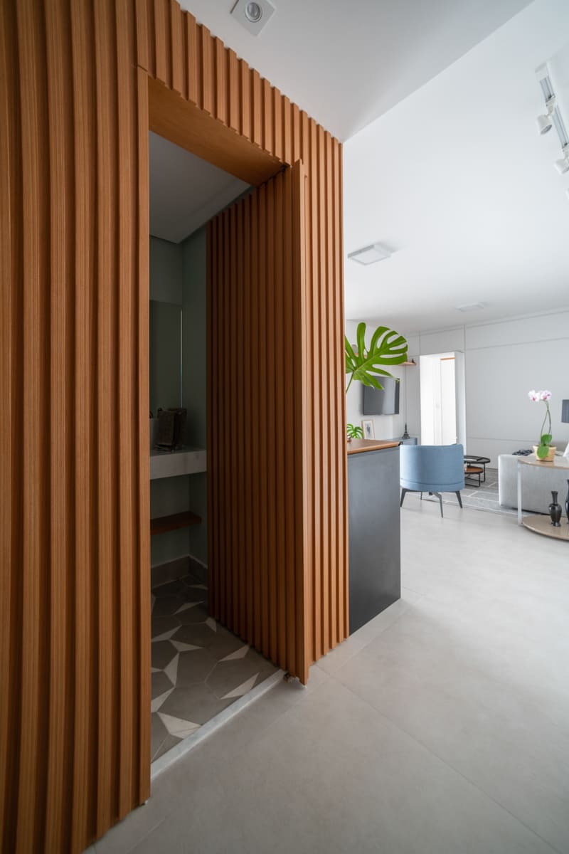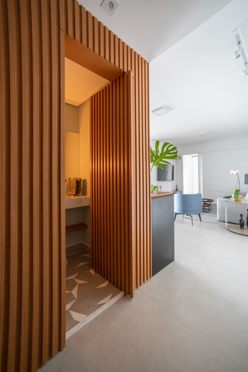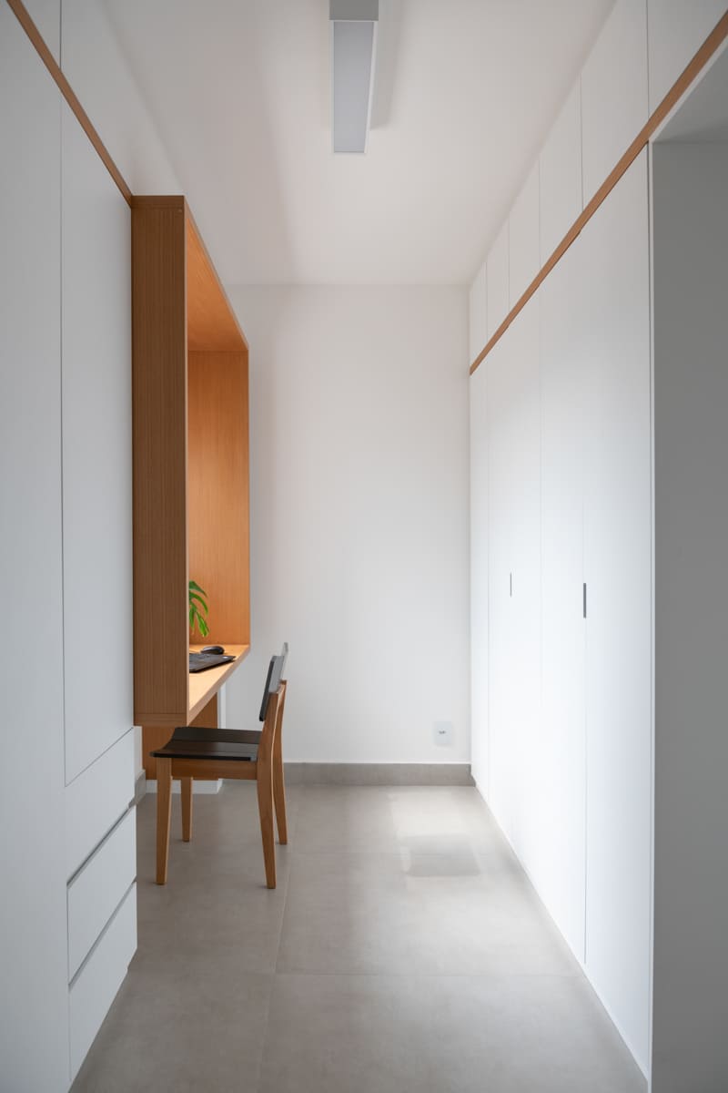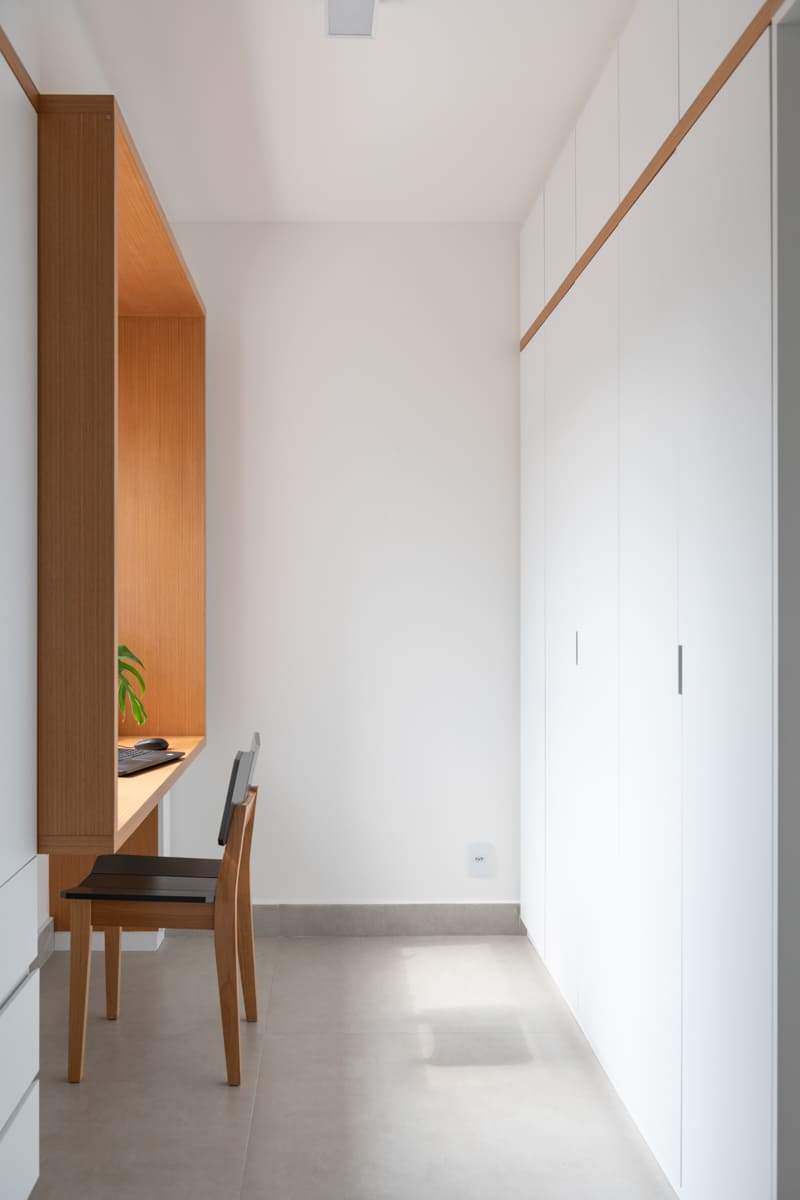 A bancada de concreto moldada in loco reforça essa linguagem mais bruta e sincera, contrastando de forma elegante com a marcenaria suave que costura os espaços. O desenho do mobiliário foi pensado de forma integrada ao projeto arquitetônico e à rotina do casal, equilibrando funcionalidade e afeto. O freijó linheiro aparece em diferentes intensidades — mais presente no painel ripado da entrada e de forma delicada nos detalhes do armário do closet — criando uma narrativa contínua entre os ambientes.