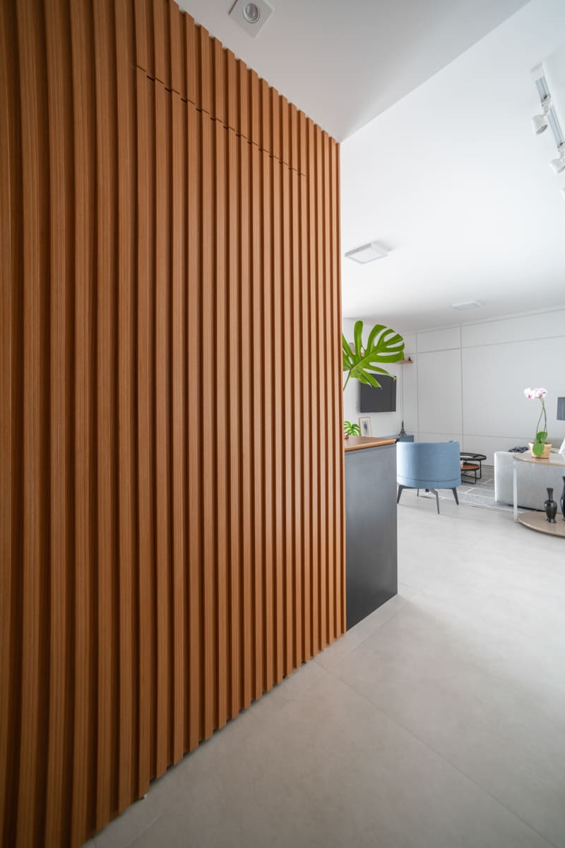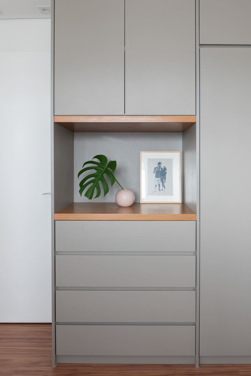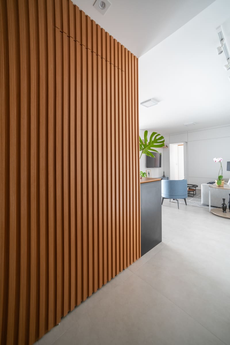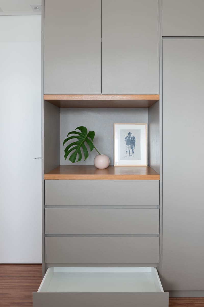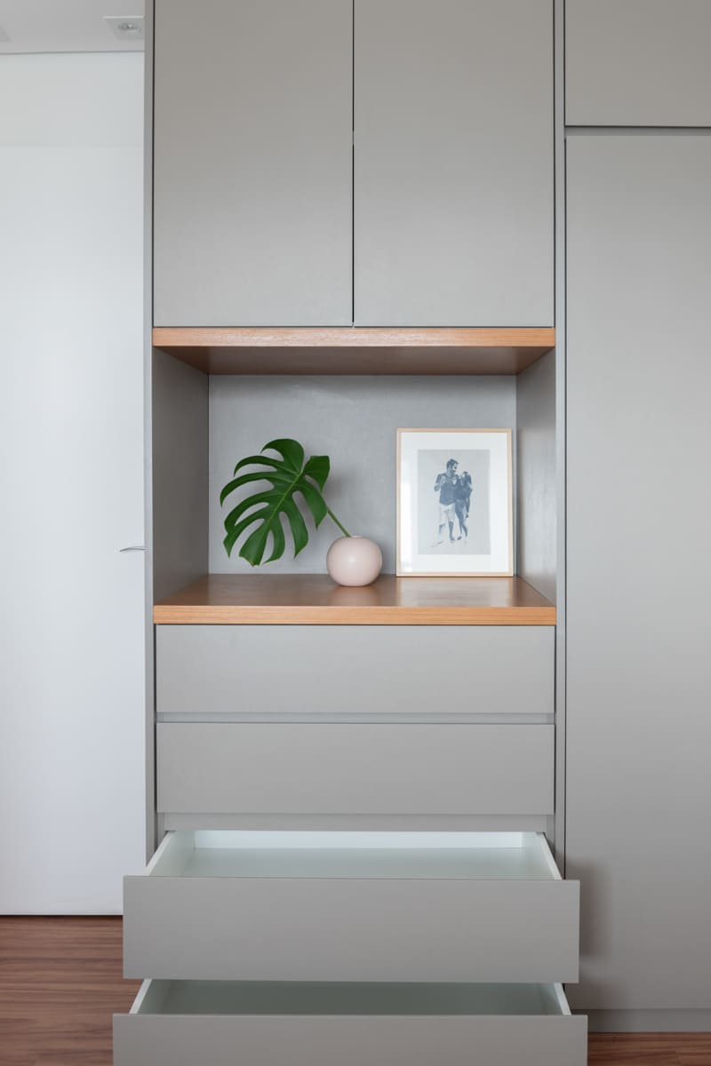 A bancada de concreto moldada in loco reforça essa linguagem mais bruta e sincera, contrastando de forma elegante com a marcenaria suave que costura os espaços. O desenho do mobiliário foi pensado de forma integrada ao projeto arquitetônico e à rotina do casal, equilibrando funcionalidade e afeto. O freijó linheiro aparece em diferentes intensidades — mais presente no painel ripado da entrada e de forma delicada nos detalhes do armário do closet — criando uma narrativa contínua entre os ambientes.