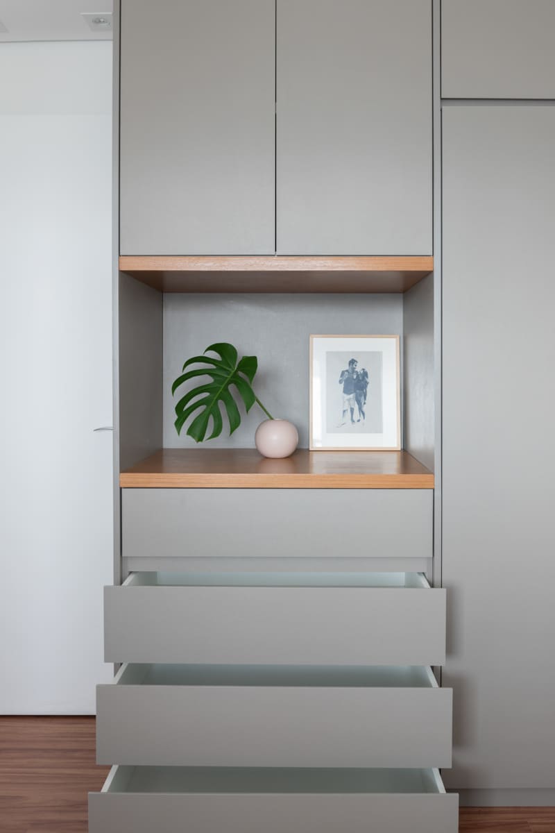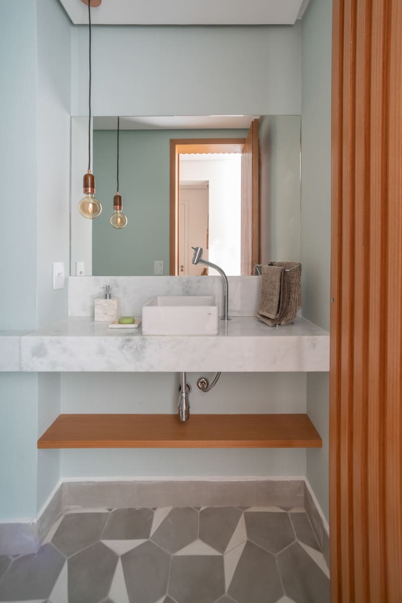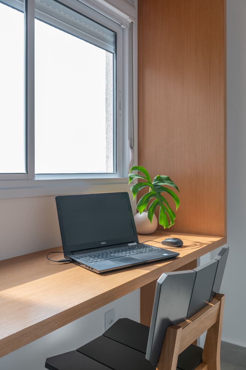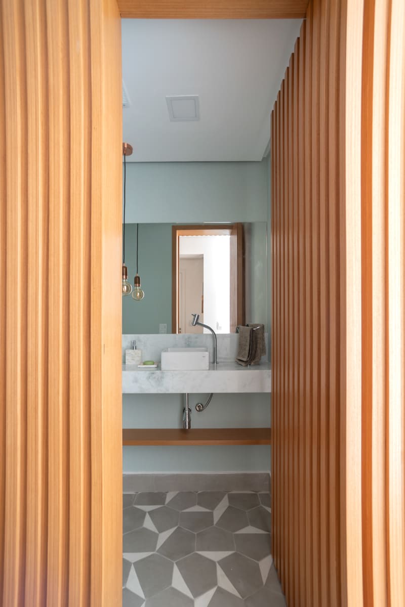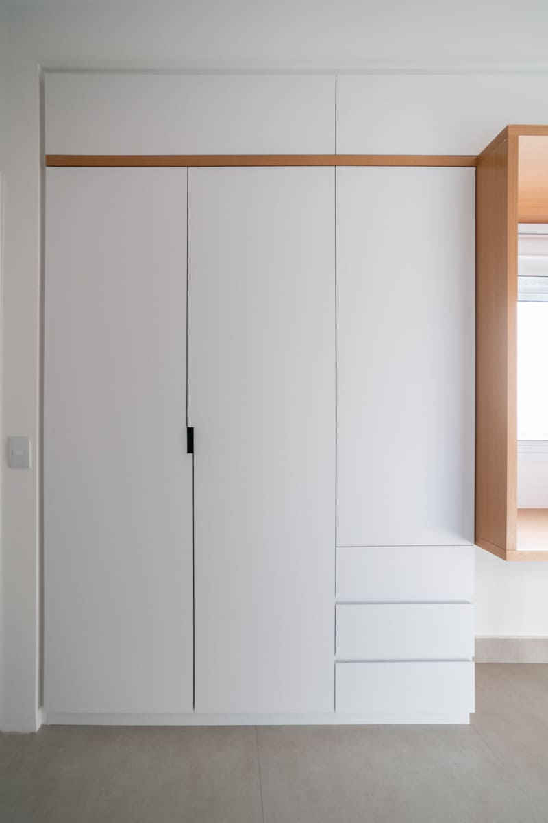 A bancada de concreto moldada in loco reforça essa linguagem mais bruta e sincera, contrastando de forma elegante com a marcenaria suave que costura os espaços. O desenho do mobiliário foi pensado de forma integrada ao projeto arquitetônico e à rotina do casal, equilibrando funcionalidade e afeto. O freijó linheiro aparece em diferentes intensidades — mais presente no painel ripado da entrada e de forma delicada nos detalhes do armário do closet — criando uma narrativa contínua entre os ambientes.