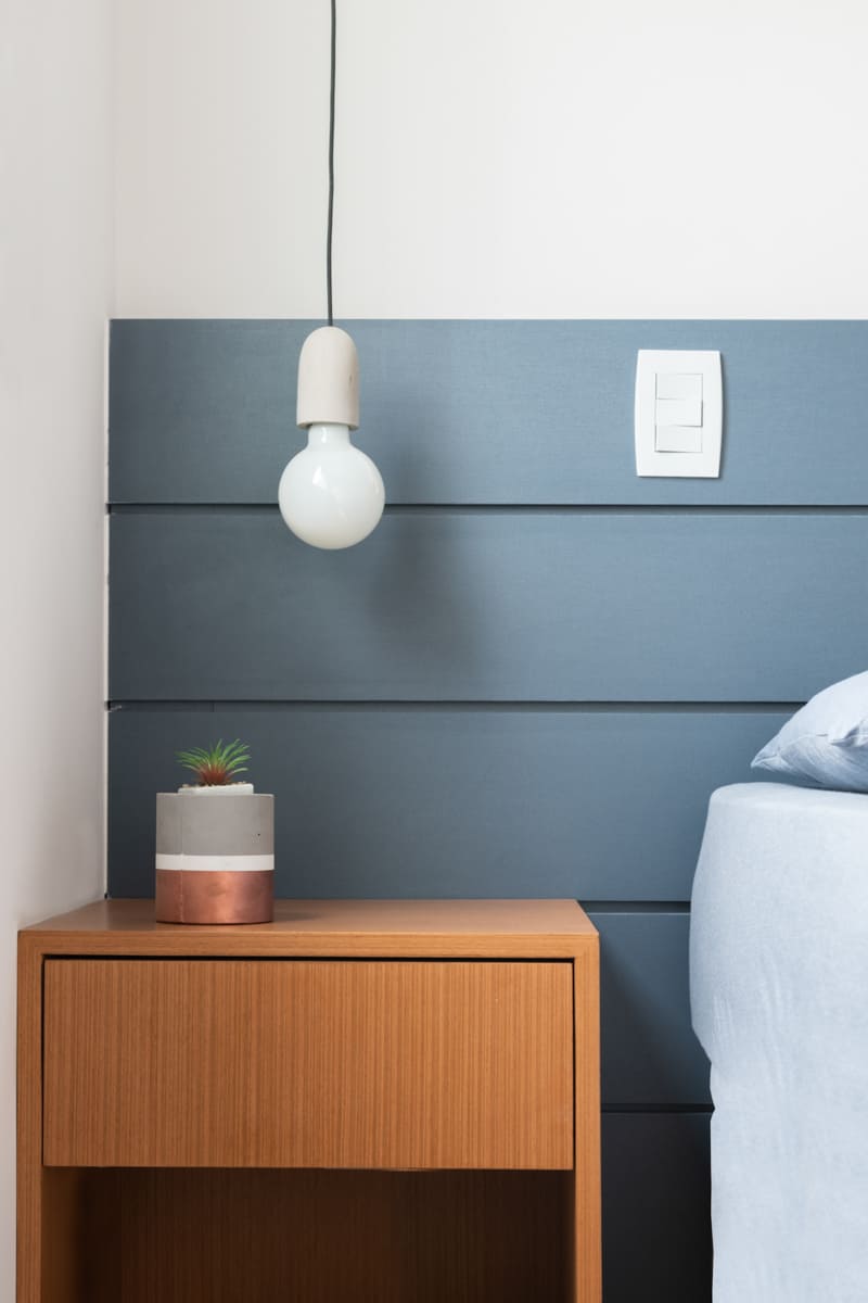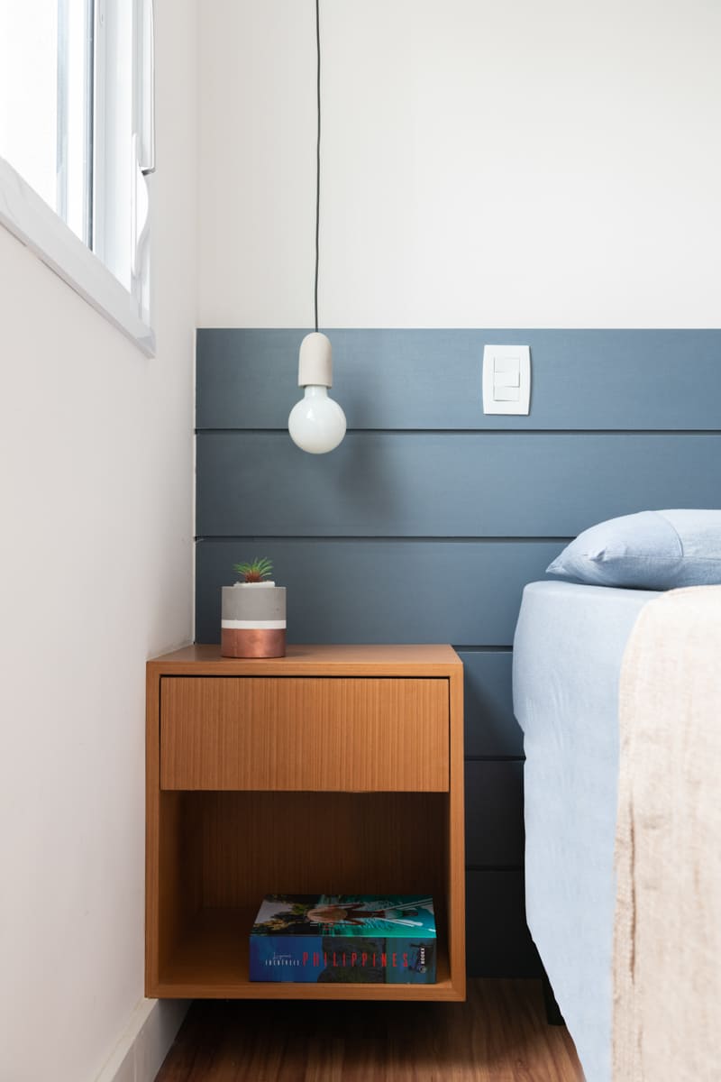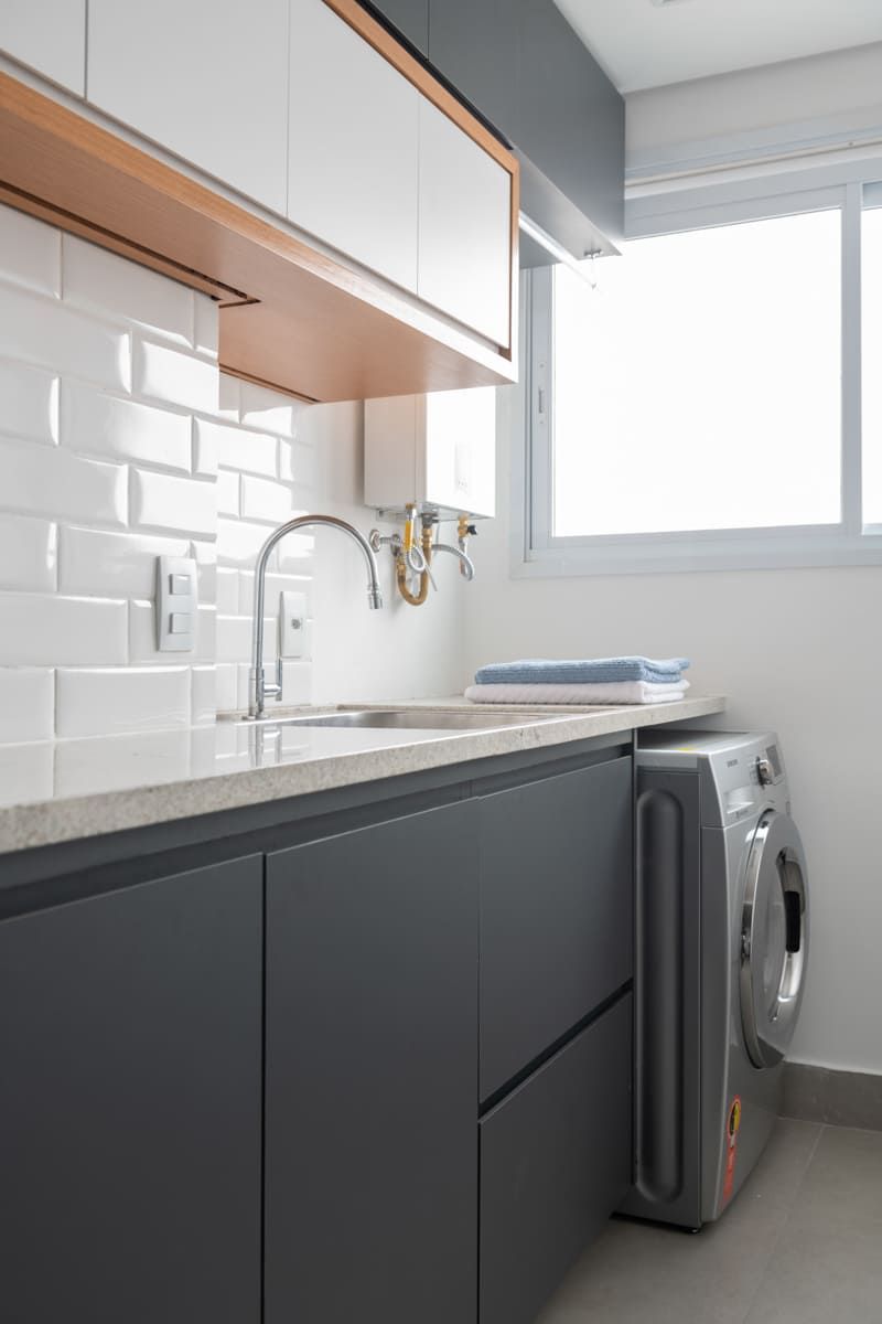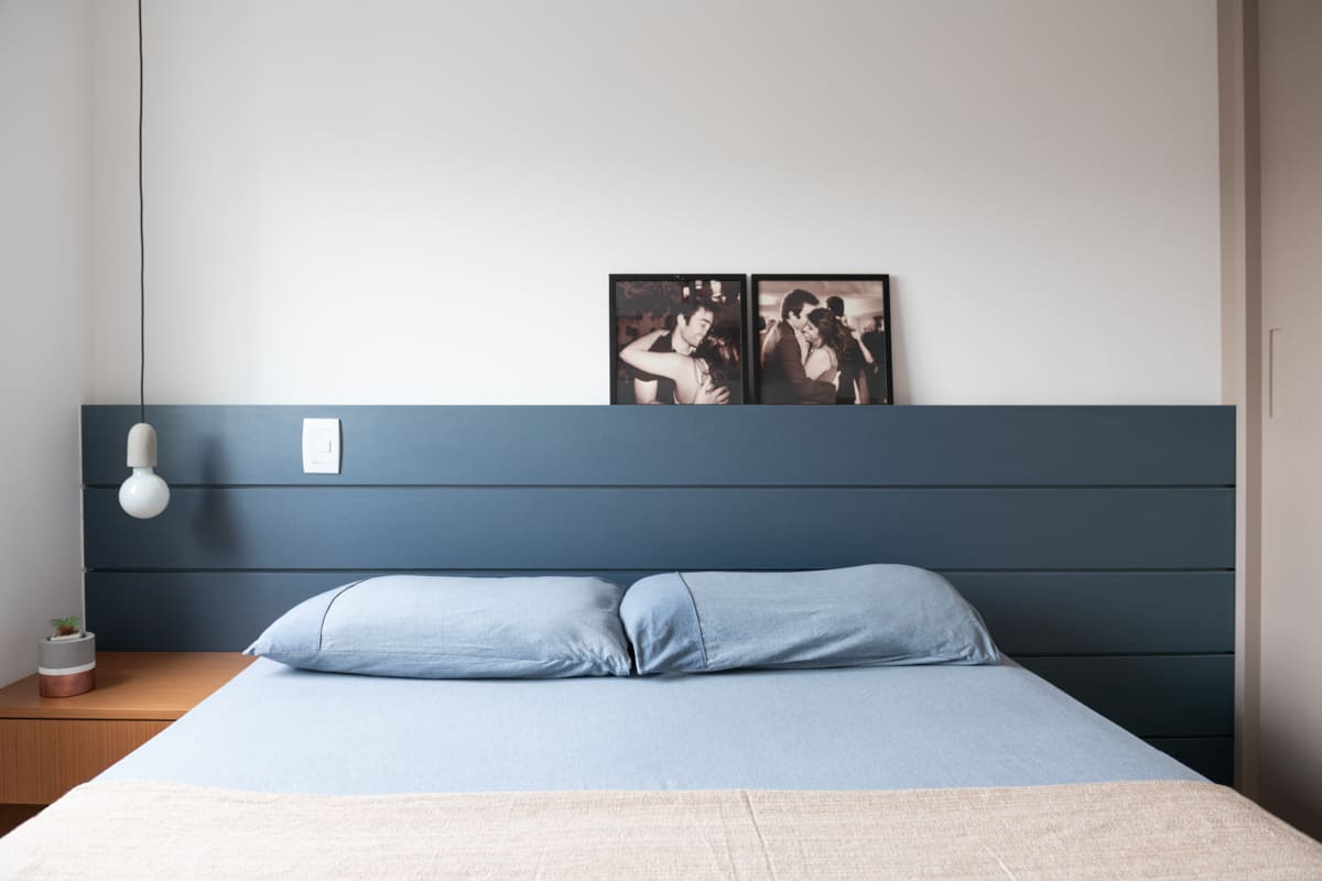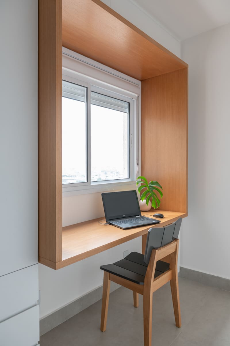 A bancada de concreto moldada in loco reforça essa linguagem mais bruta e sincera, contrastando de forma elegante com a marcenaria suave que costura os espaços. O desenho do mobiliário foi pensado de forma integrada ao projeto arquitetônico e à rotina do casal, equilibrando funcionalidade e afeto. O freijó linheiro aparece em diferentes intensidades — mais presente no painel ripado da entrada e de forma delicada nos detalhes do armário do closet — criando uma narrativa contínua entre os ambientes.