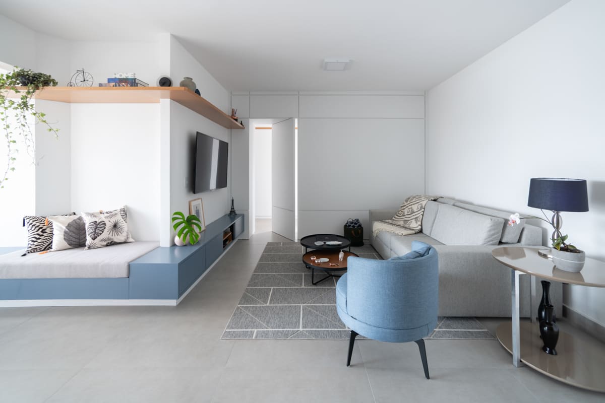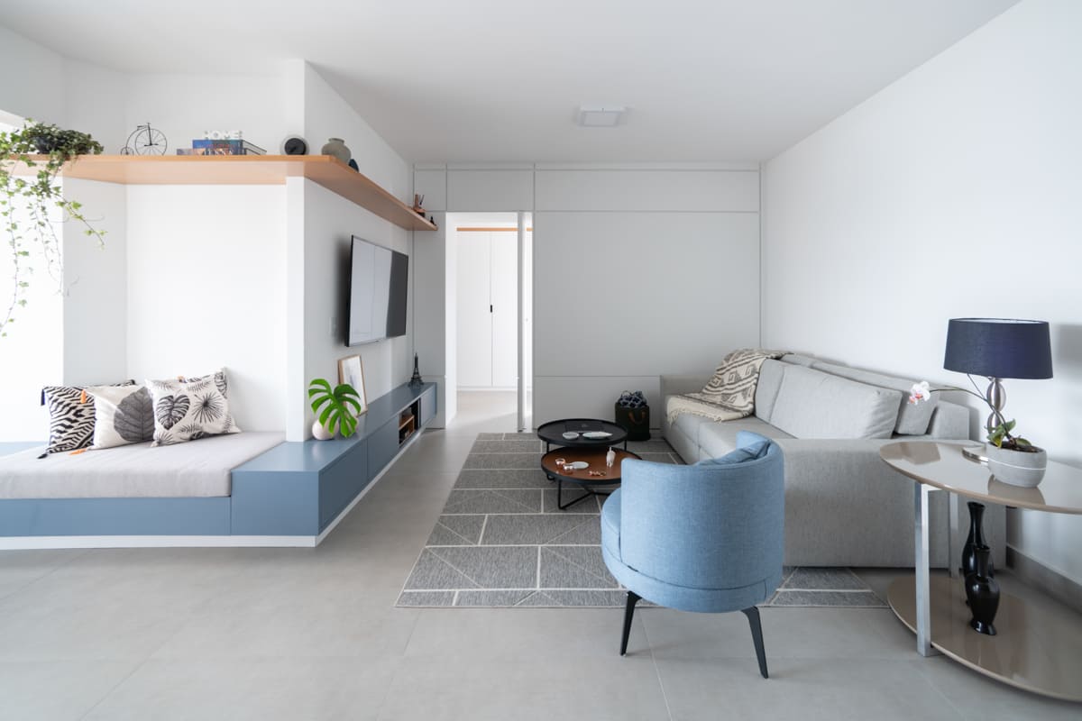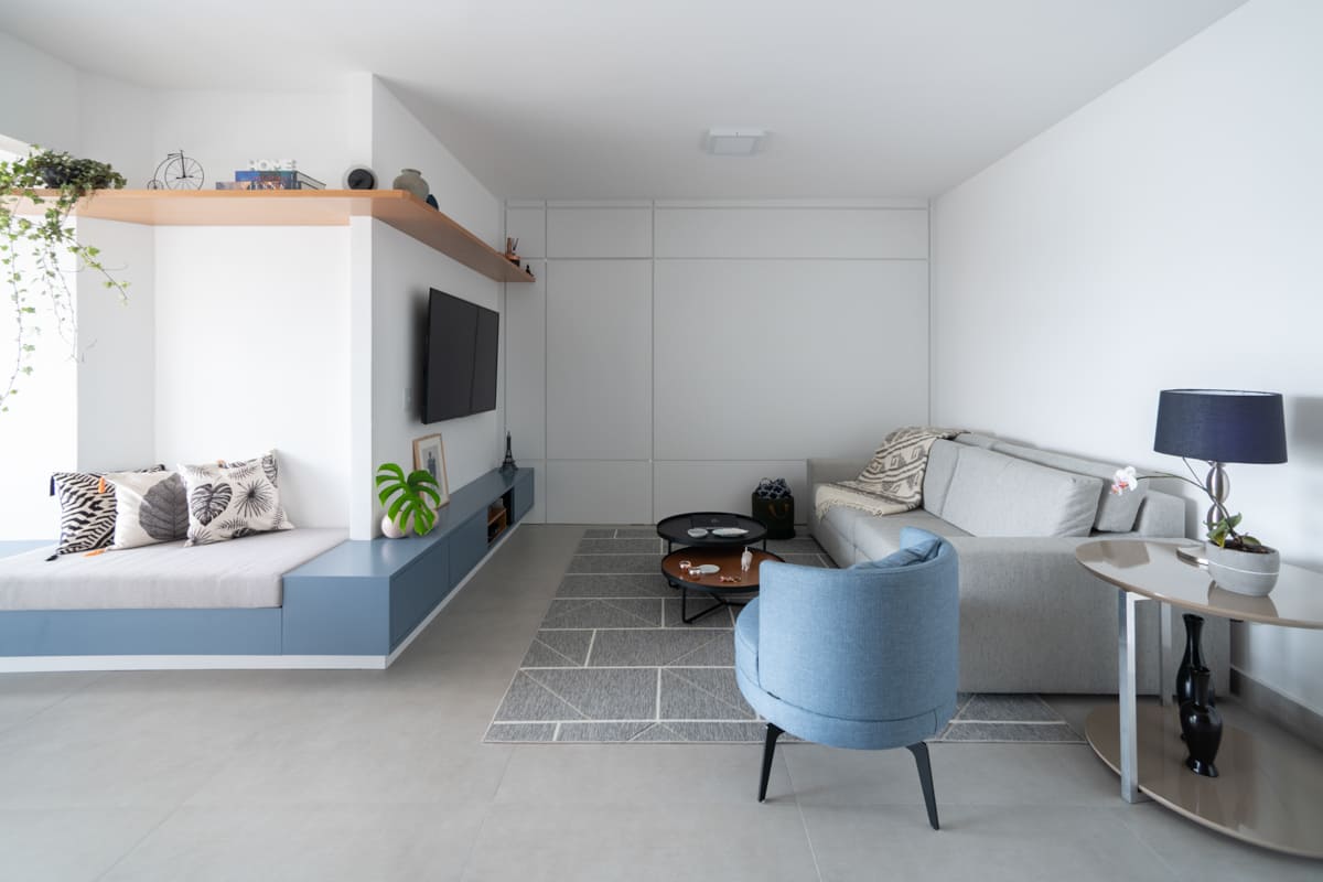 A integração dos espaços foi o ponto de partida deste projeto: sala, varanda e cozinha se conectam de forma fluida, banhadas por uma luz natural incrível que percorre todo o ambiente. O piso único de porcelanato 90×90 da Cerâmica Portinari cria uma base neutra que valoriza a marcenaria em tons de azul e freijó linheiro, escolhidos para trazer aconchego e unidade visual.