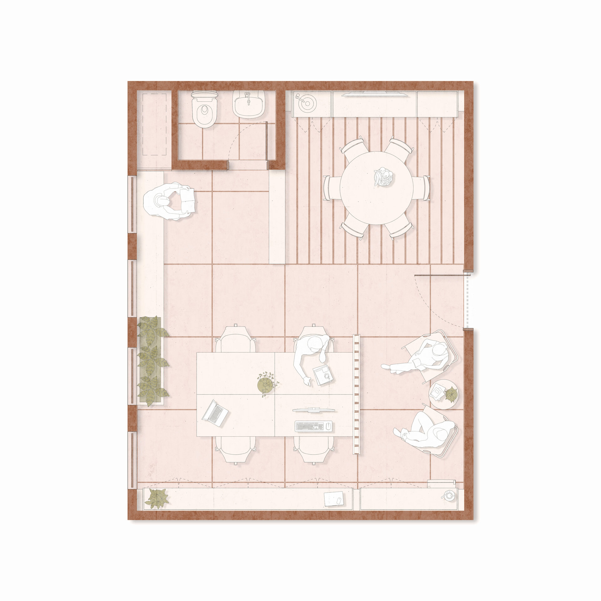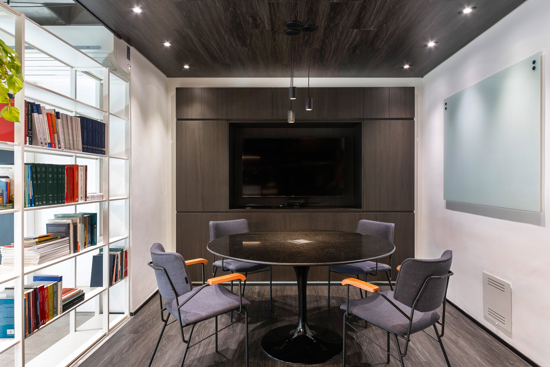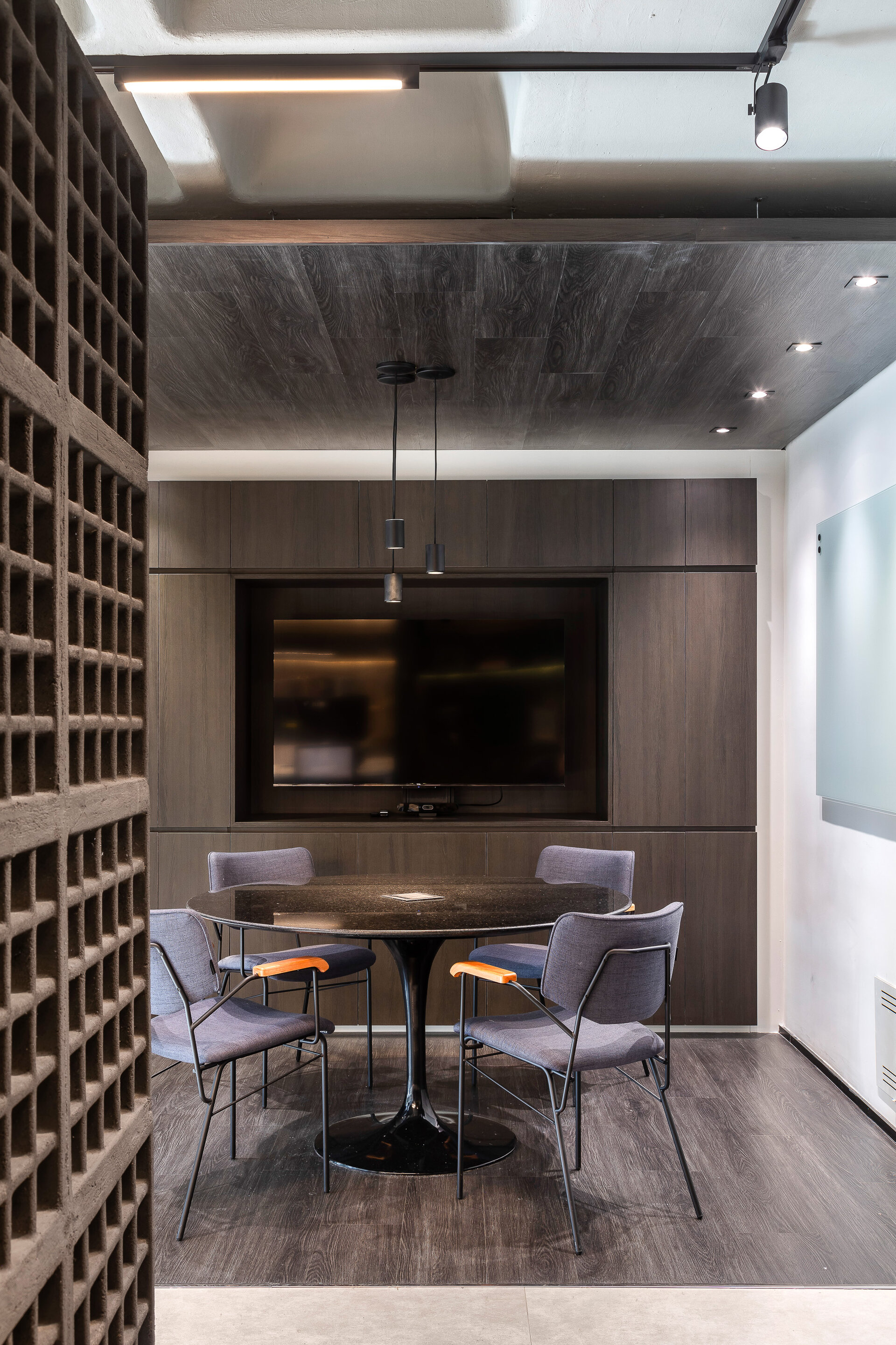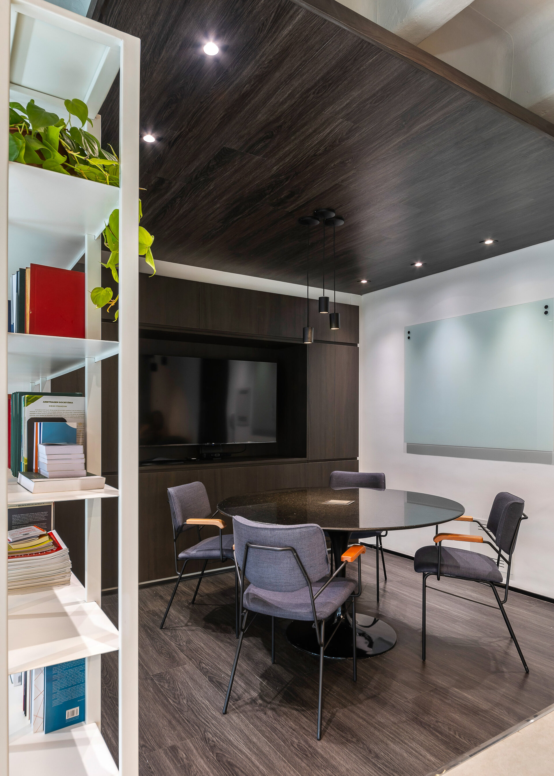 Para a sala de reuniões, criamos uma verdadeira “caixa preta”: o mesmo material do piso — réguas de vinílico da @tarkettbrasil — sobe para o forro, garantindo unidade e aconchego. No fundo, um armário de marcenaria abriga a TV e o sistema de cabeamento embutido, além de esconder uma mini copa com pia e filtro de água. Tudo milimetricamente planejado para funcionar na prática.
