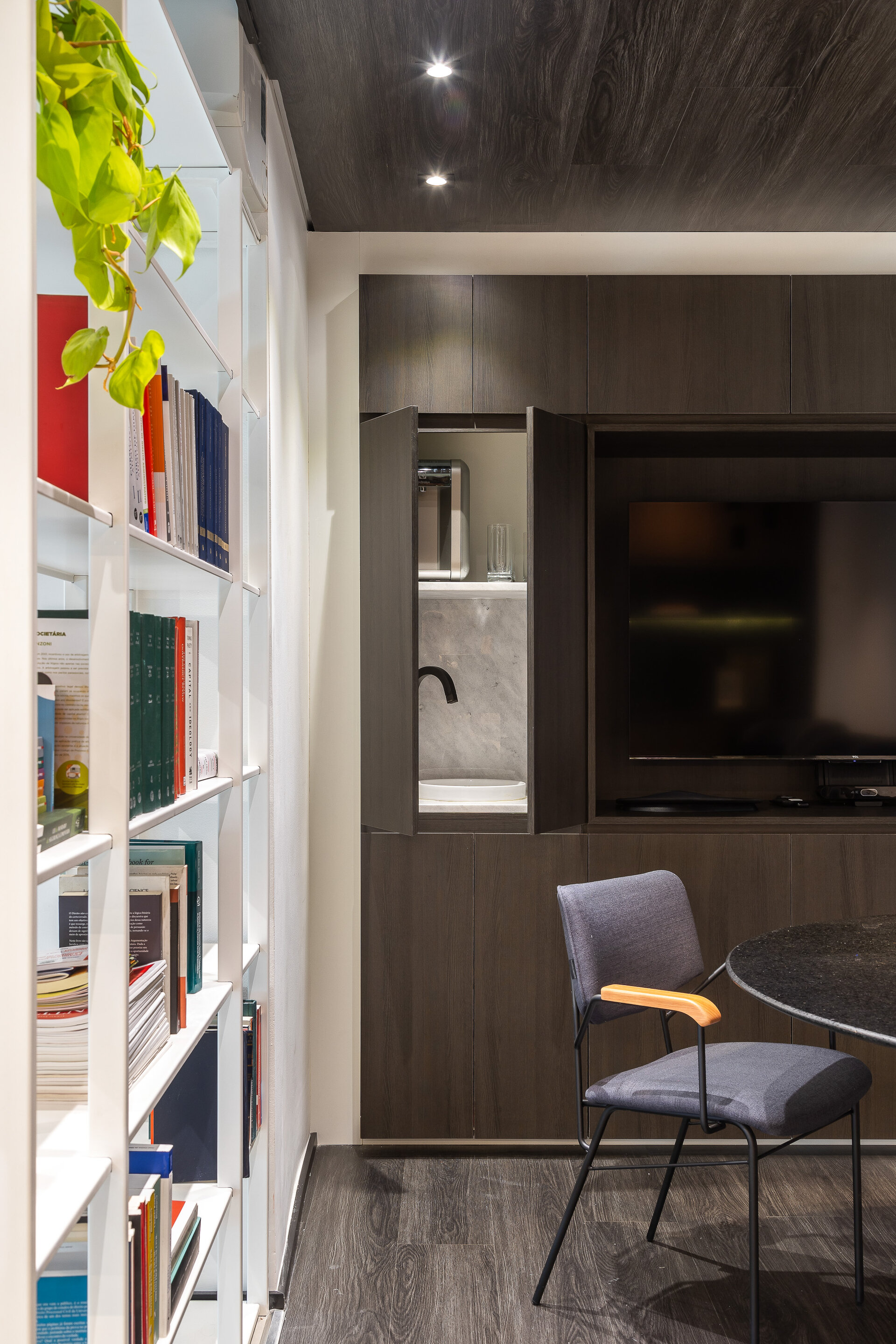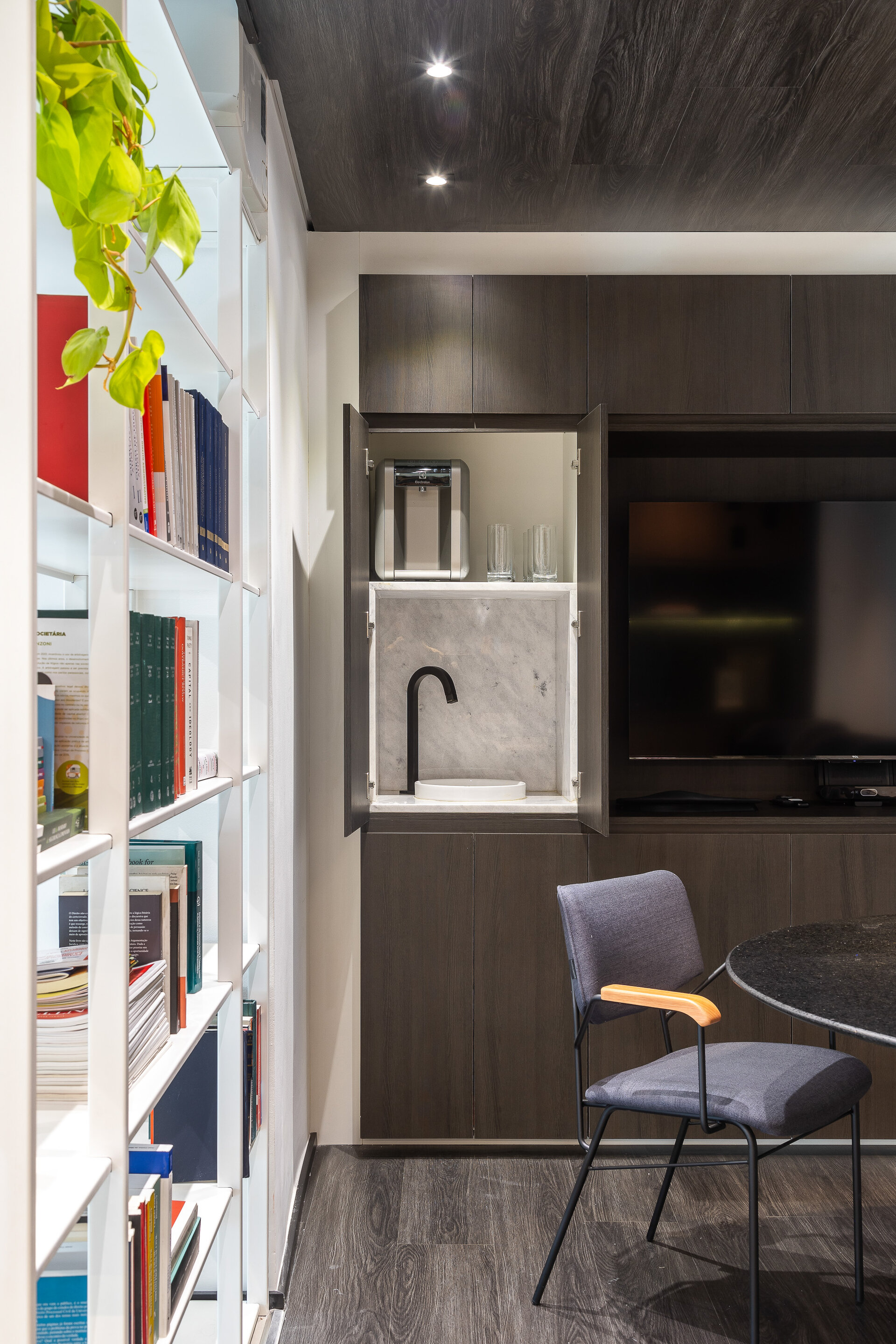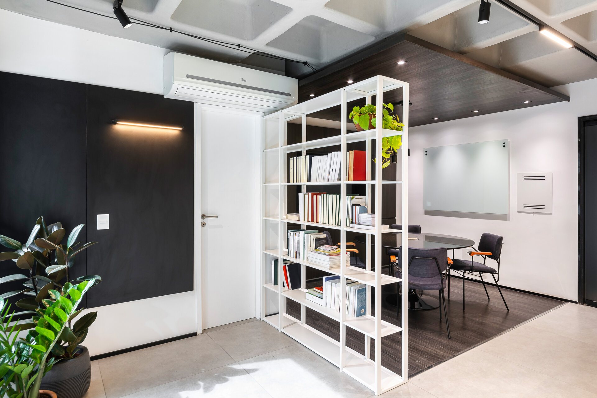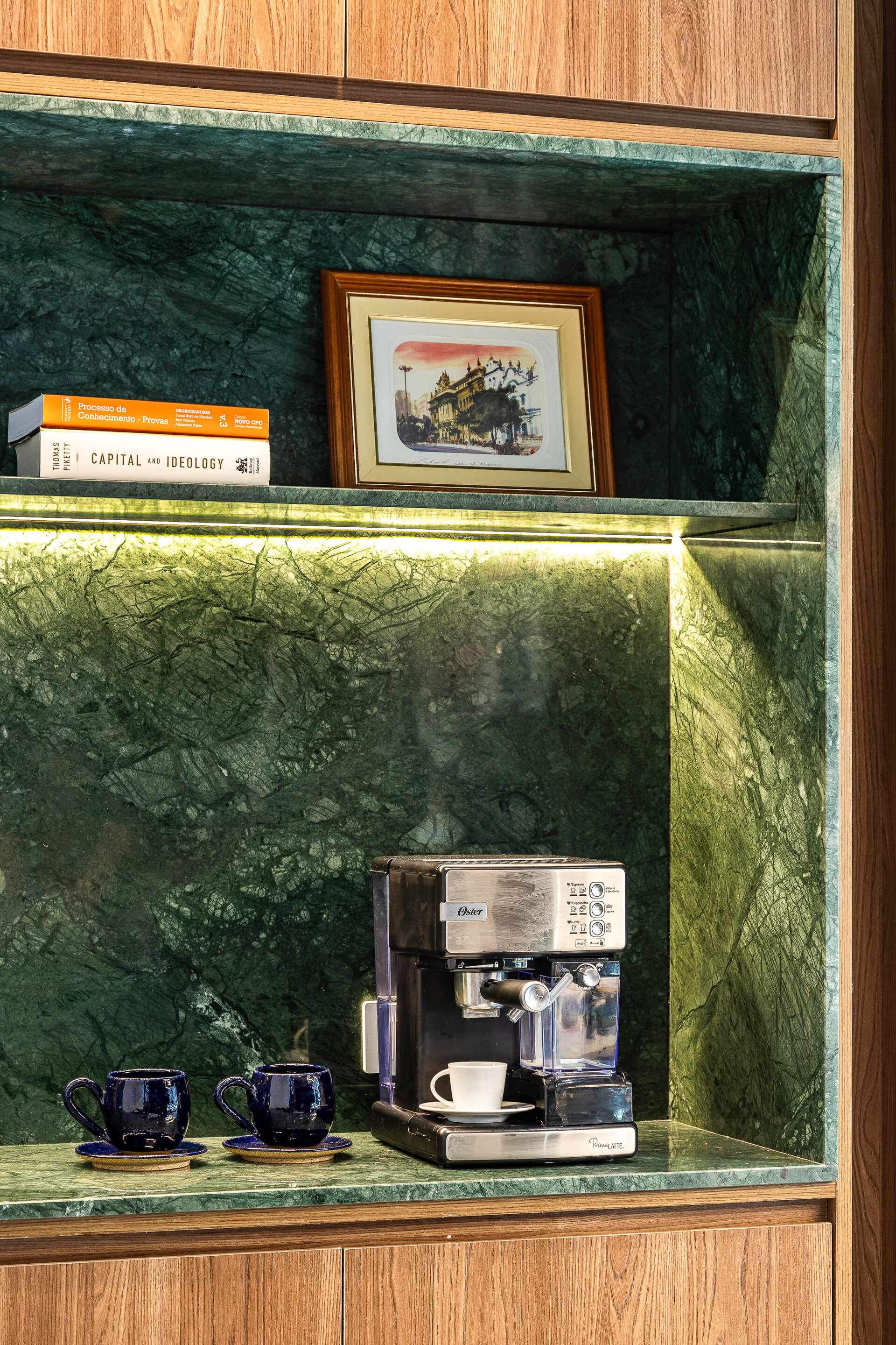 Entre as principais premissas estava a necessidade de organizar o ambiente de trabalho e criar soluções inteligentes de armazenagem para o amplo acervo de livros jurídicos. Assim, o projeto desenhou uma estante de marcenaria sob medida, que ocupa toda a parede de fundo das mesas de trabalho. Essa estante foi pensada em dois setores bem definidos: um dedicado à área do café e frigobar, e outro voltado ao trabalho e guarda de livros.